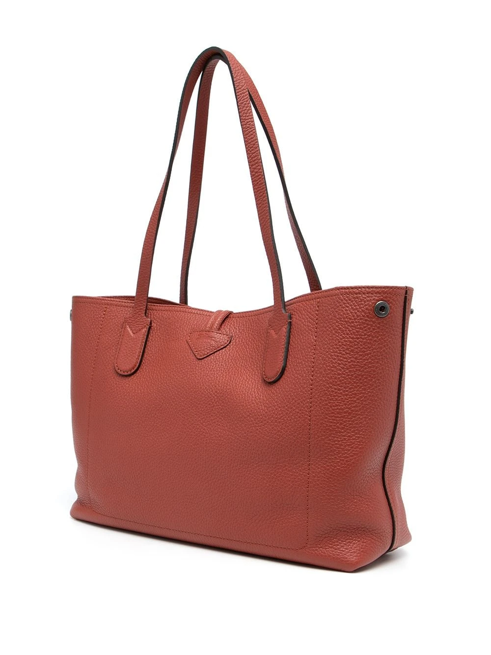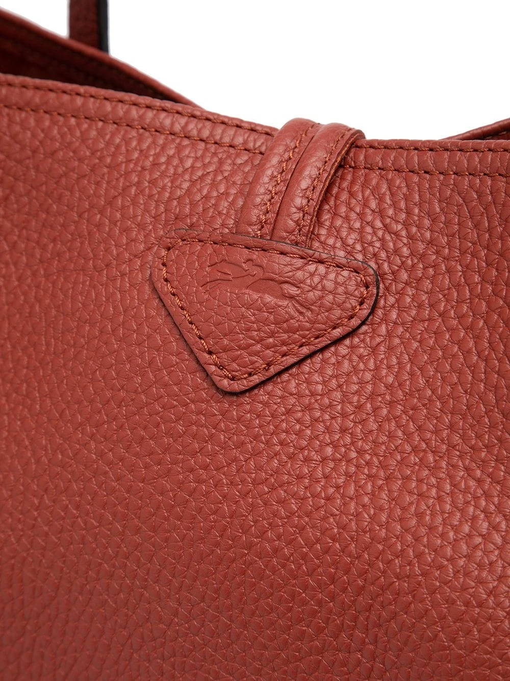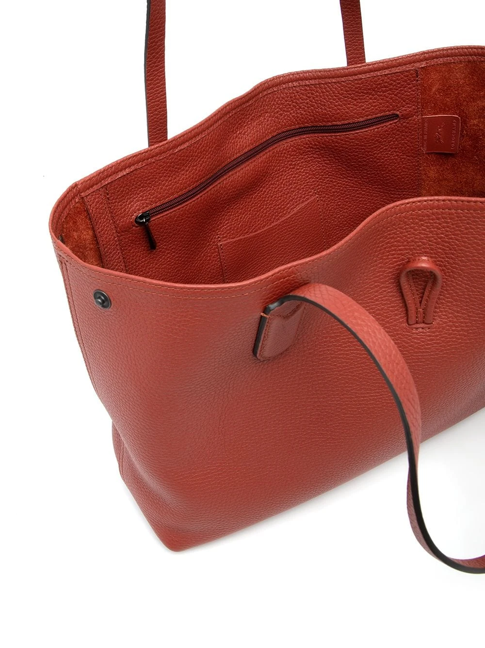 Texture grainée, logo embossé à l’arrière, coutures ton sur ton, fermeture duffle-coat sur le devant, compartiment principal, deux longues anses sur le dessus, poche intérieure zippée. Matière : cuir.