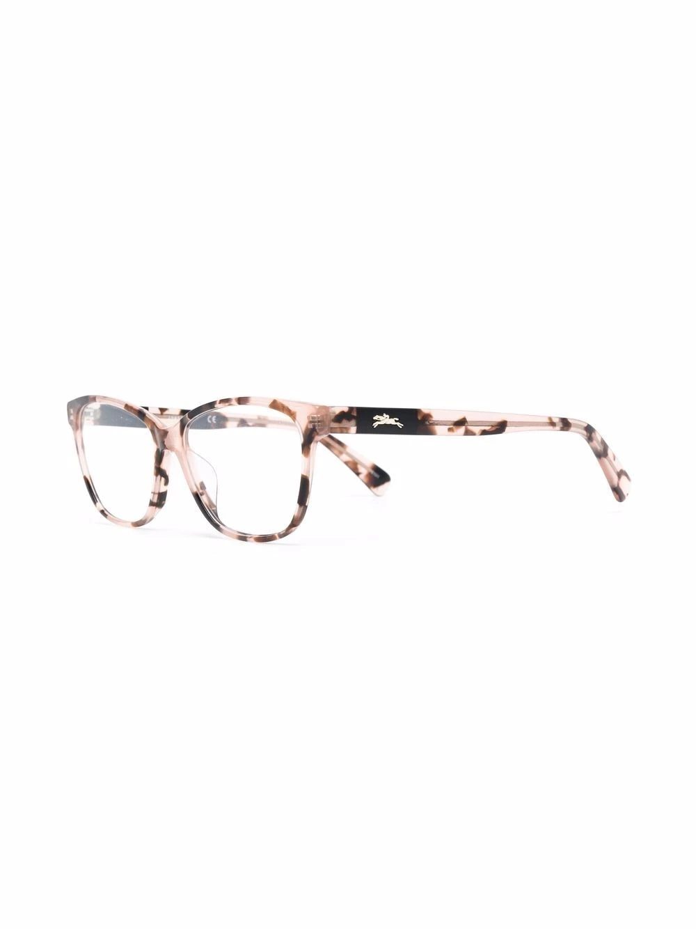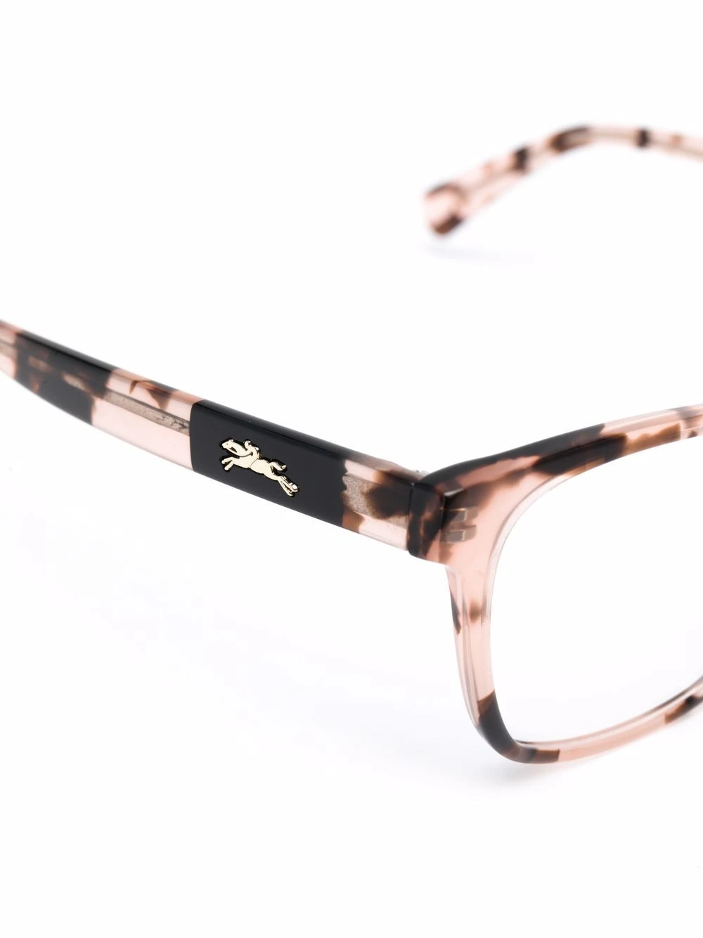 Monture carrée, verres transparents, verre à détail de décalque, effet écaille de tortue, plaquettes de nez, empiècements latéraux à détail de logo, branches droites, branches droites. Matière : acétate. Ces lunettes sont livrées avec un étui de protection.
