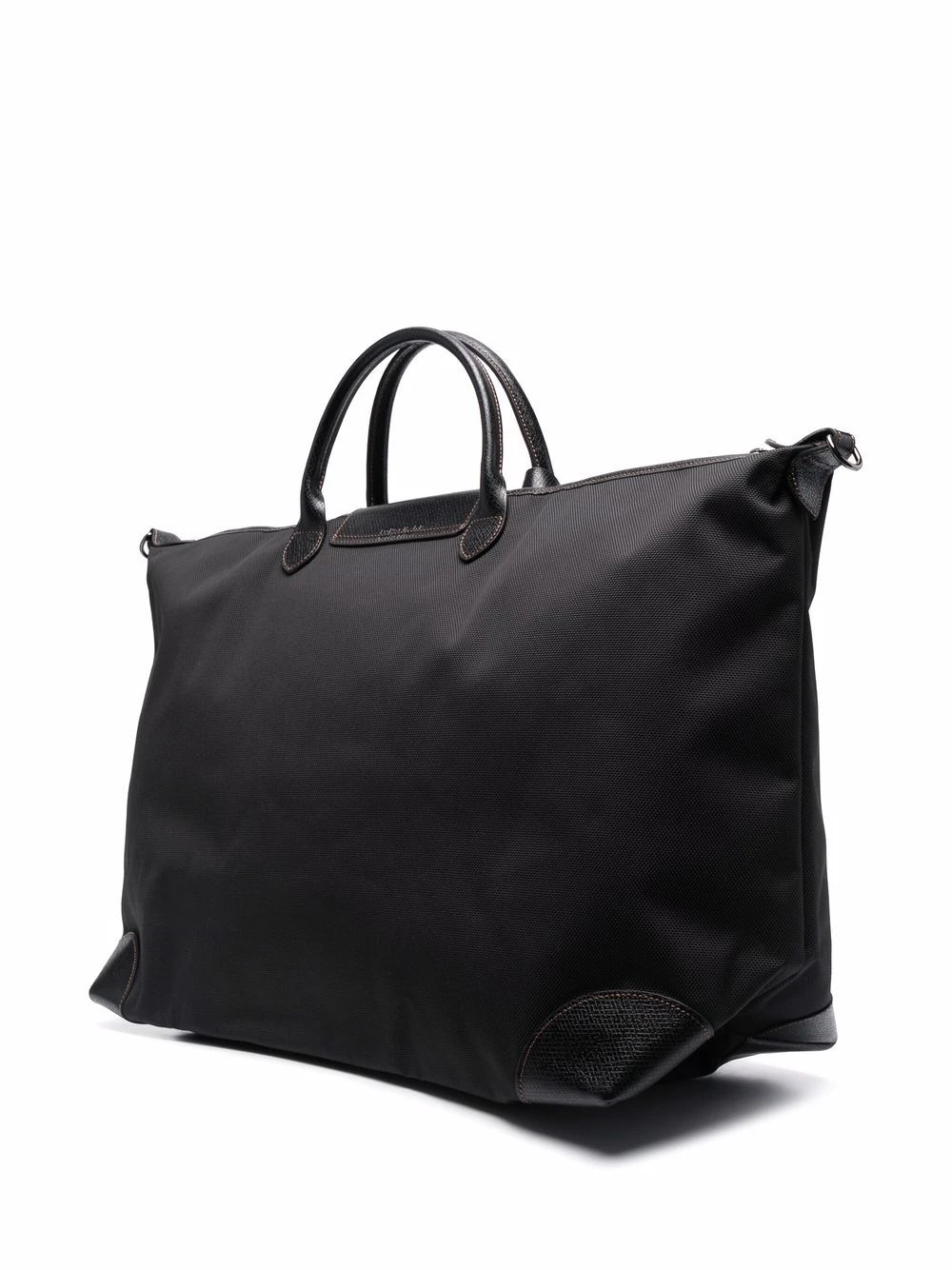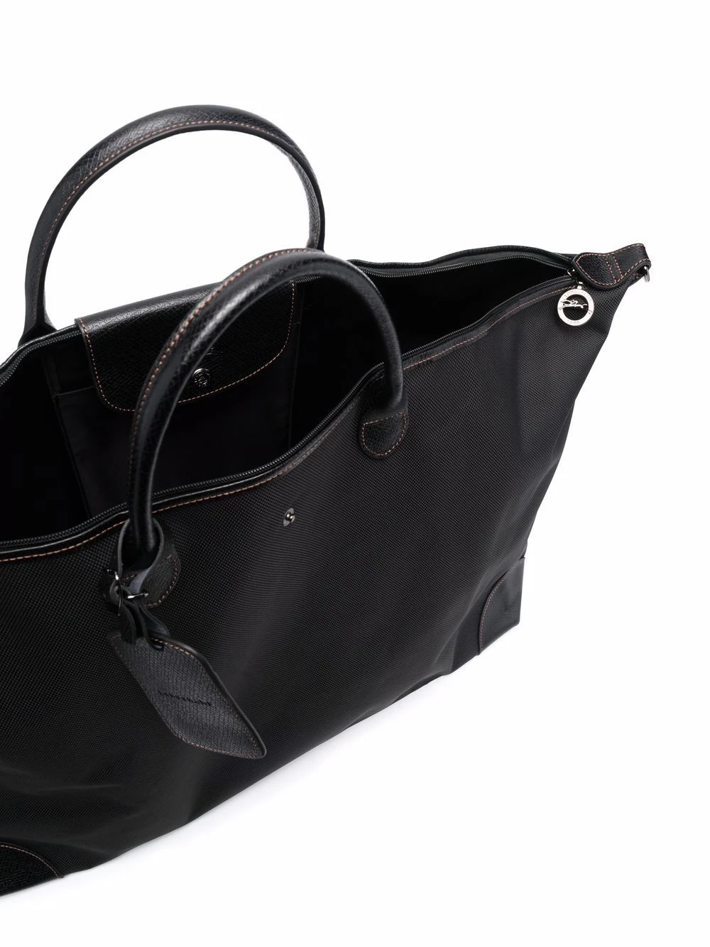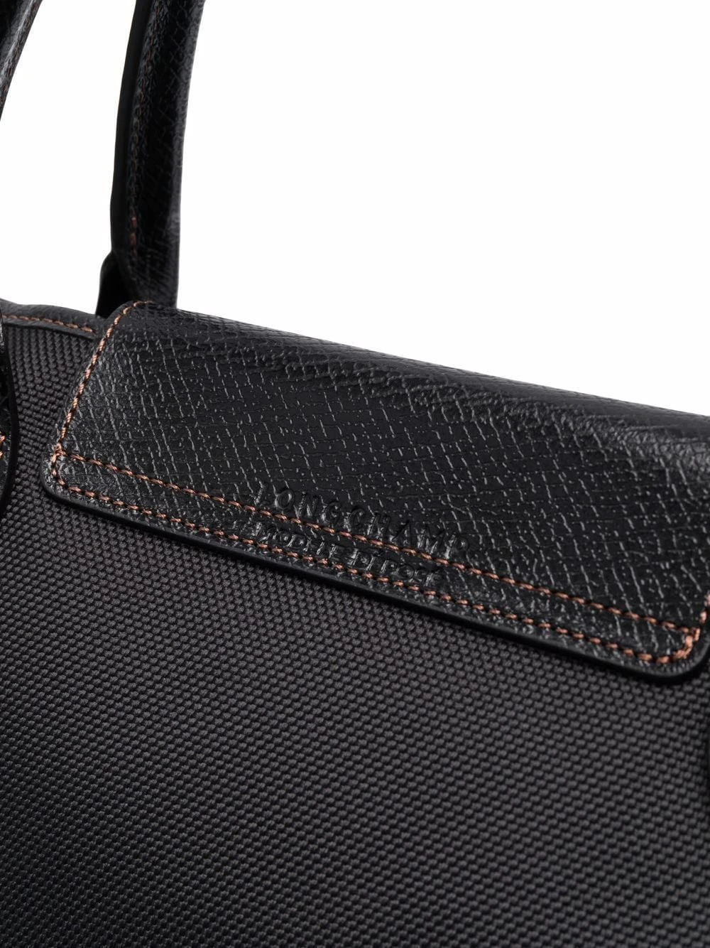Coutures contrastantes, logo embossé sur le devant, étiquette en cuir, bride porté épaule détachable, anses arrondies, fermeture zippée sur le dessus, compartiment principal, poche intérieure plaquée. Couleur : noir. Matière : cuir.