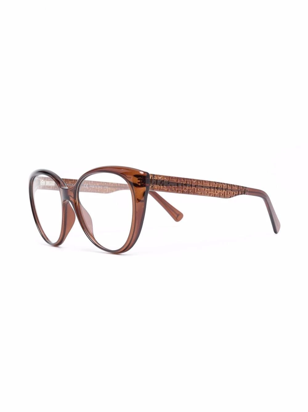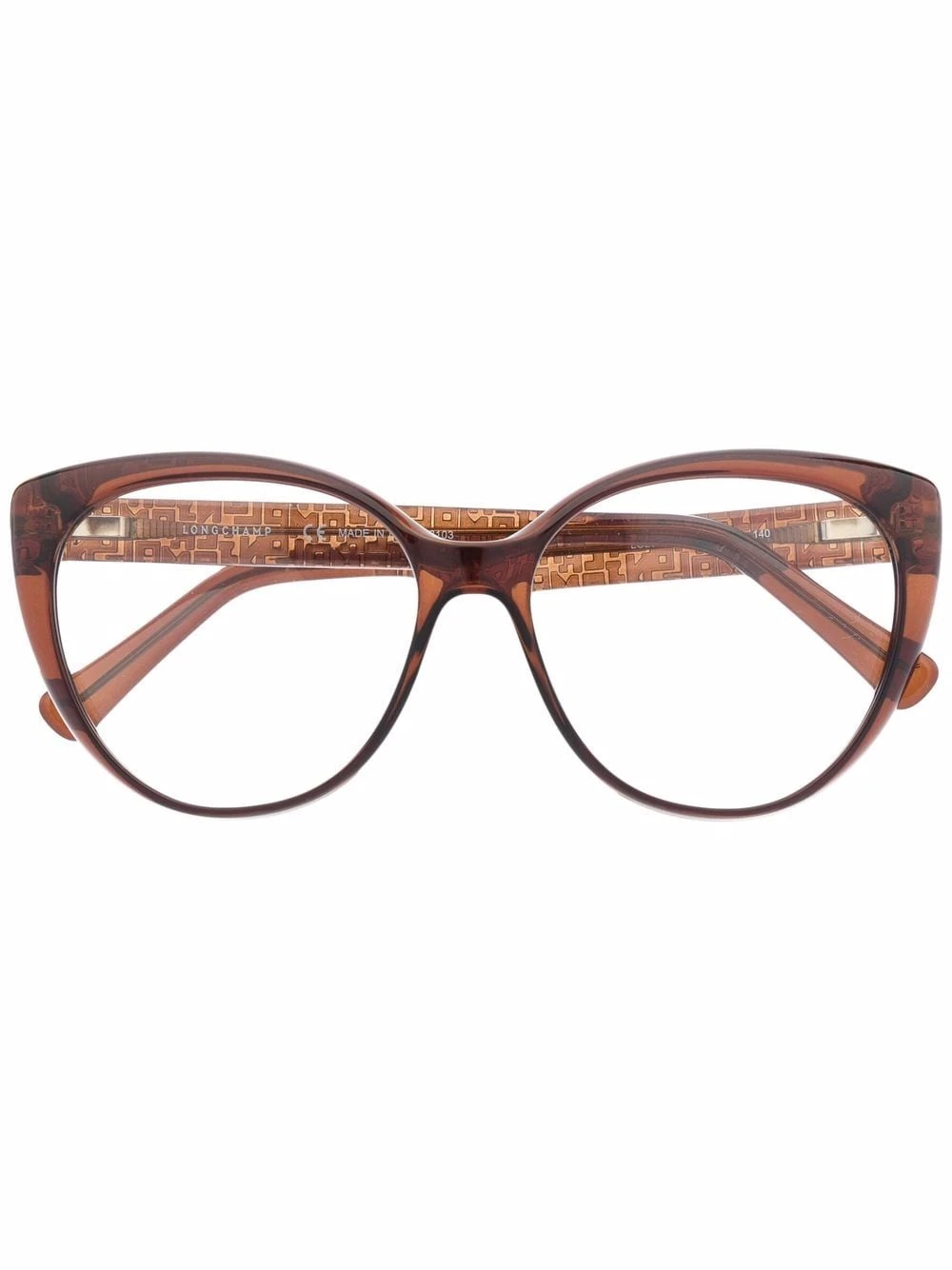 Monture papillon, verres transparents, verre à détail de décalque, logo gravé sur la branche, branches droites. Couleur : marron. Matière : acétate. Ces lunettes sont livrées avec un étui de protection.