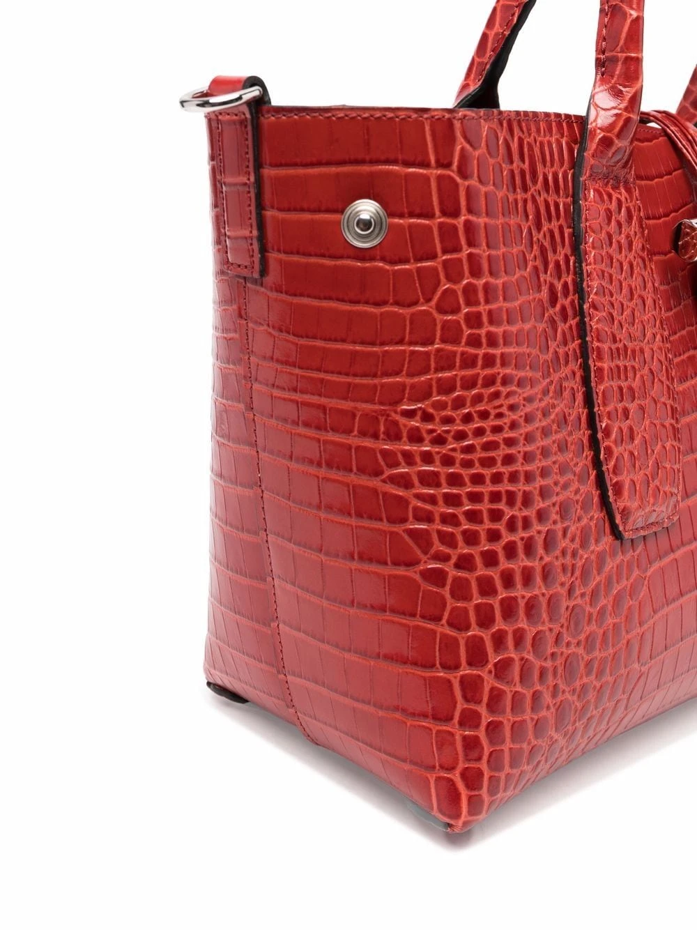 Effet peau de crocodile, anses arrondies, compartiment principal, poches intérieures zippées, bride porté épaule détachable. Matière : cuir de veau.