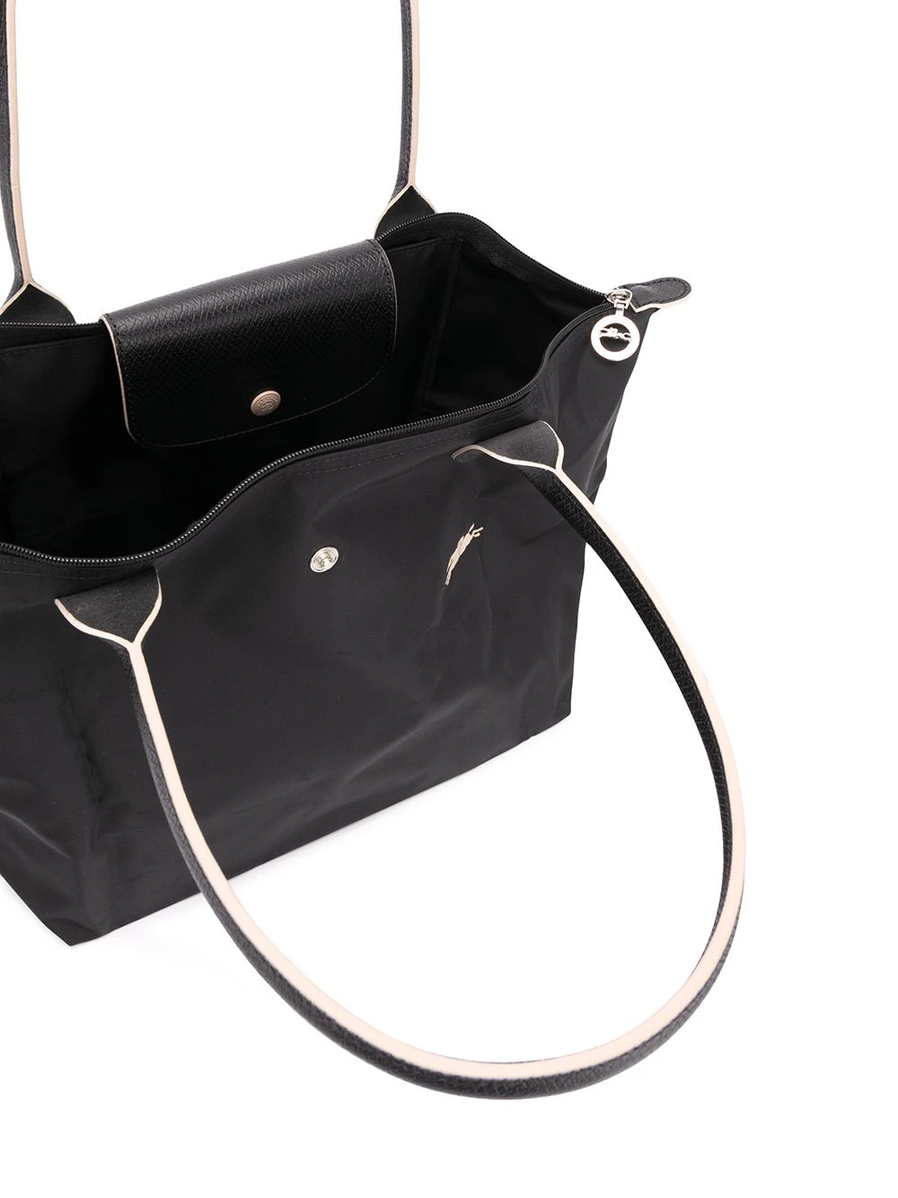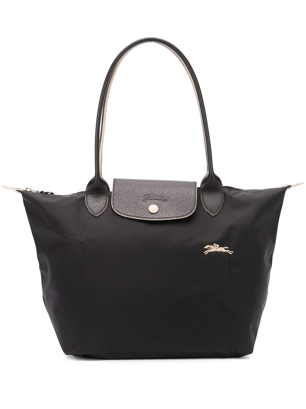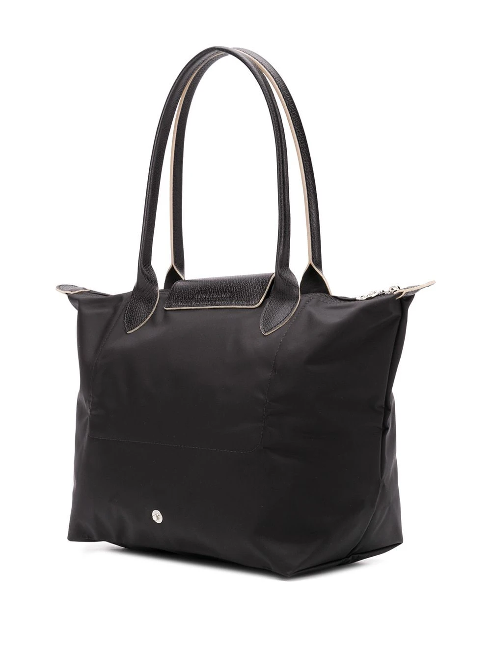 Sac cabas Le Pliage Longchamp avec anses sur le dessus, bordure en cuir, logo brodé sur le devant, logo embossé et fermeture zippée sur le dessus. Couleur : noir.