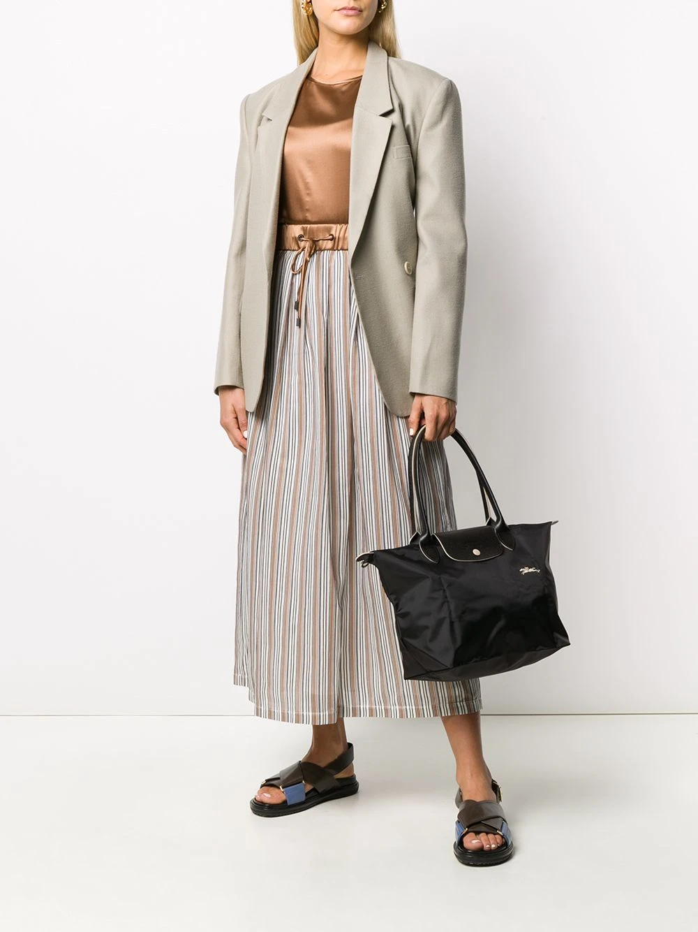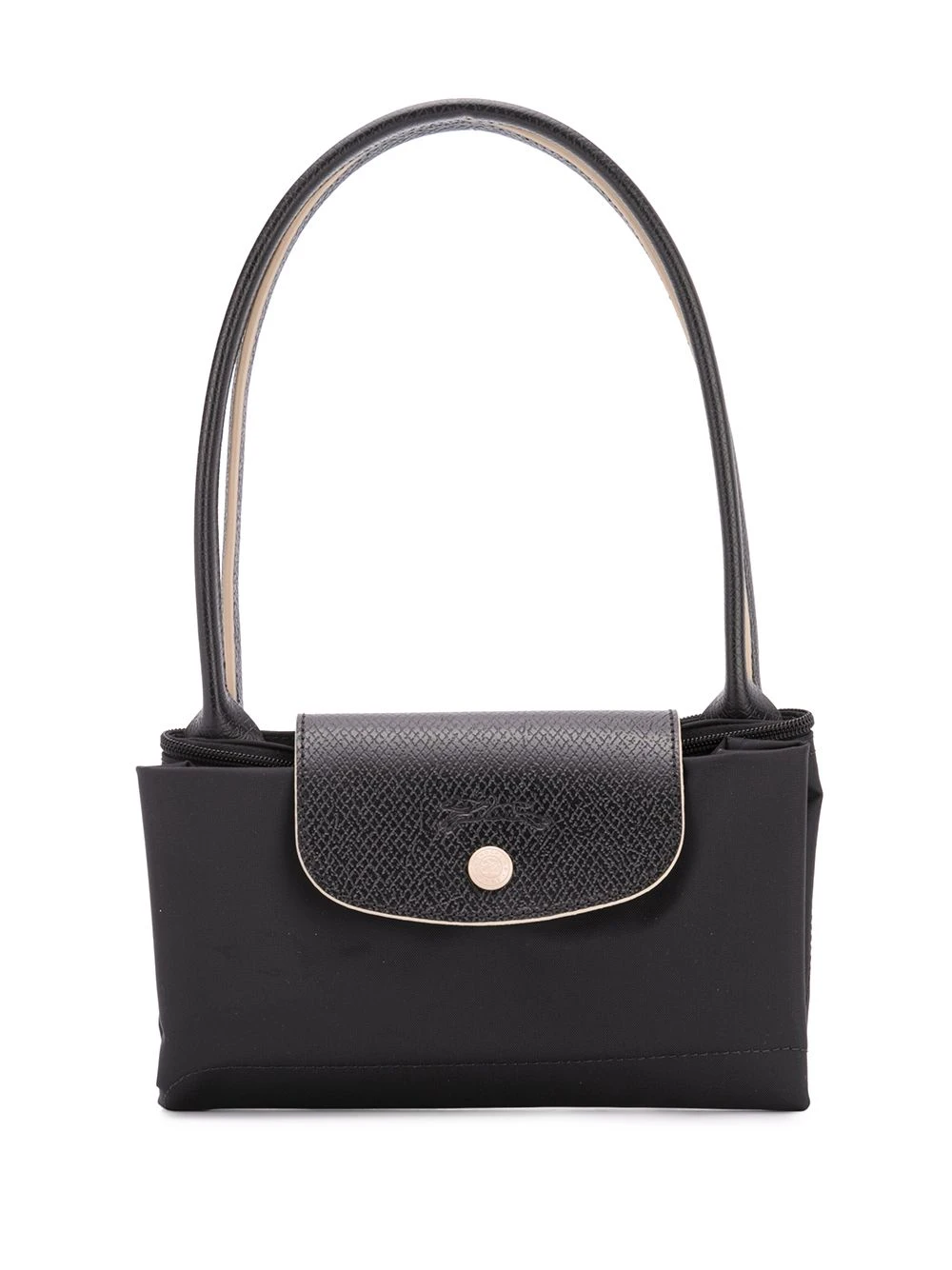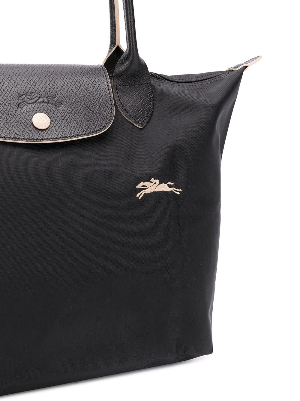 Sac cabas Le Pliage Longchamp avec anses sur le dessus, bordure en cuir, logo brodé sur le devant, logo embossé et fermeture zippée sur le dessus. Couleur : noir.