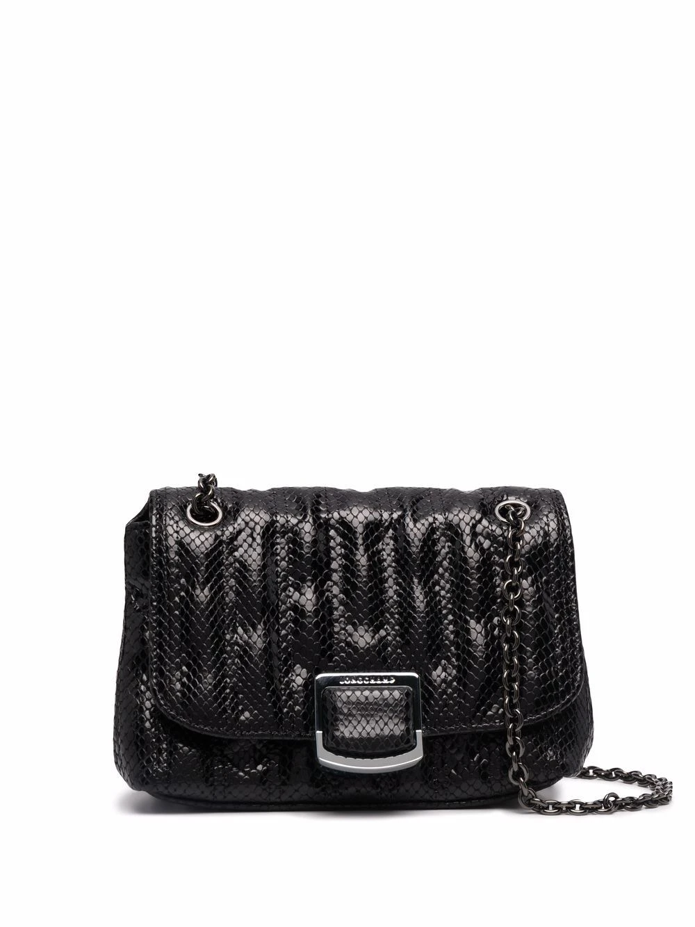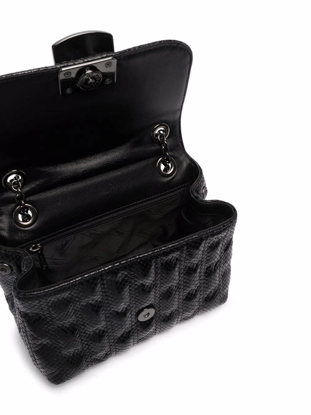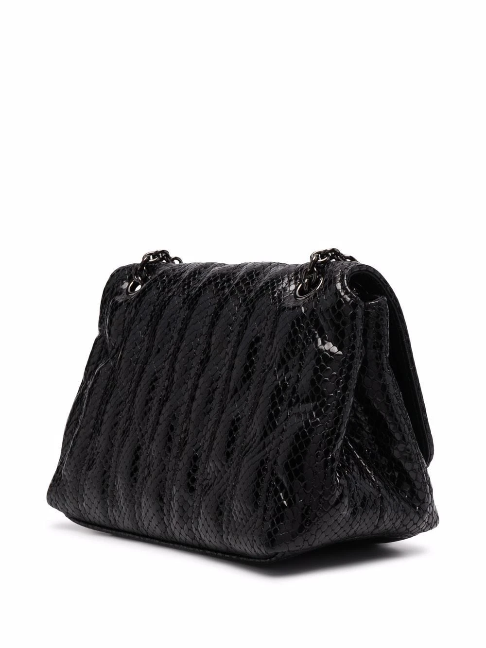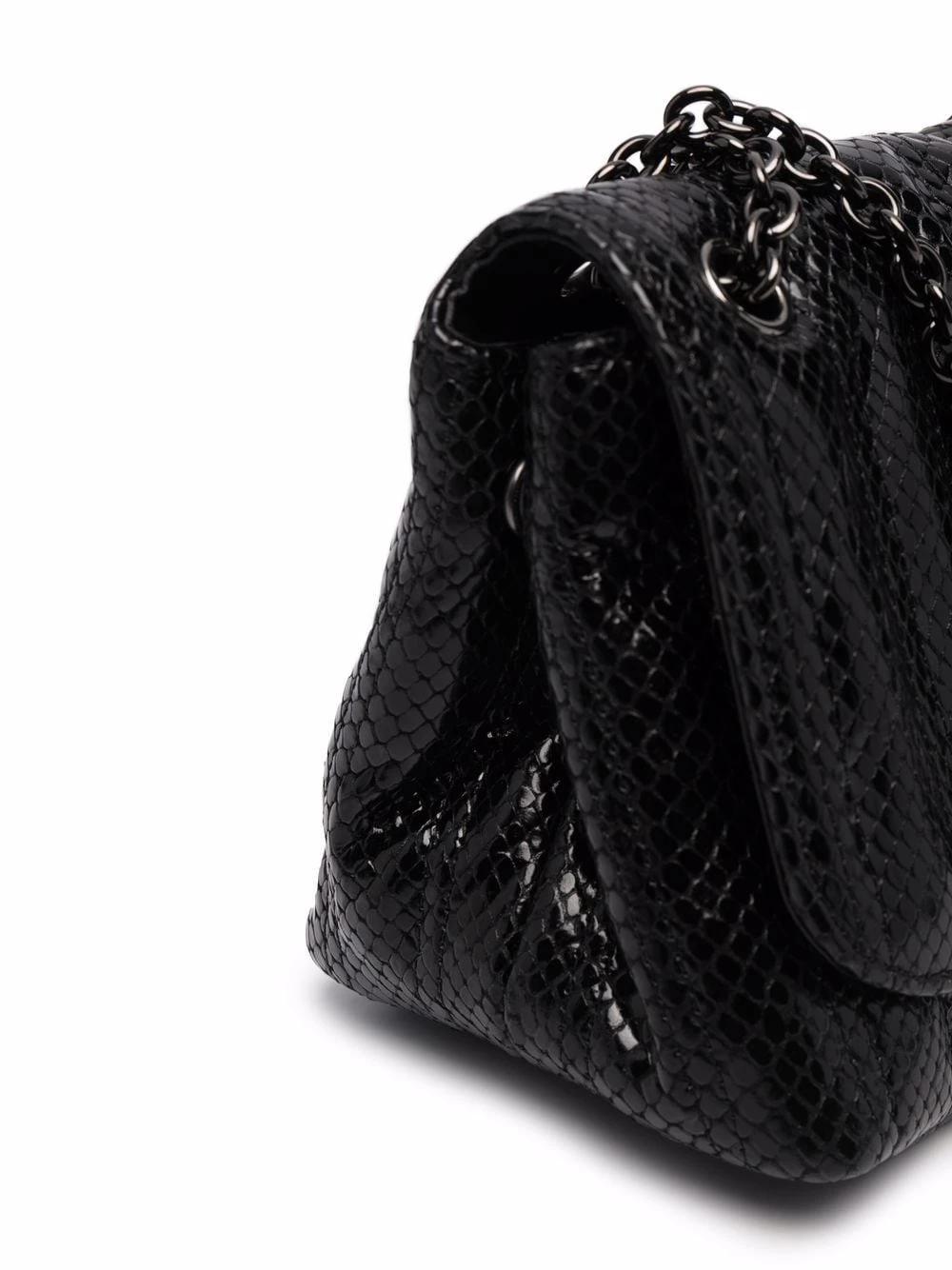 Effet peau de serpent, effet matelassé, rabat sur le dessus à fermeture magnétique, finitions en métal argenté, bride porté épaule en chaîne coulissante, poche intérieure zippée. Couleur : noir. Matière : cuir de veau.