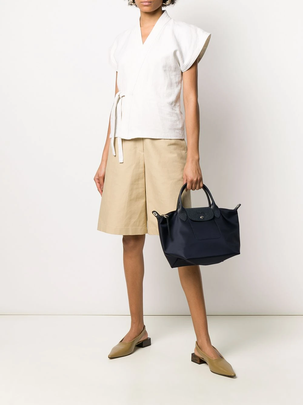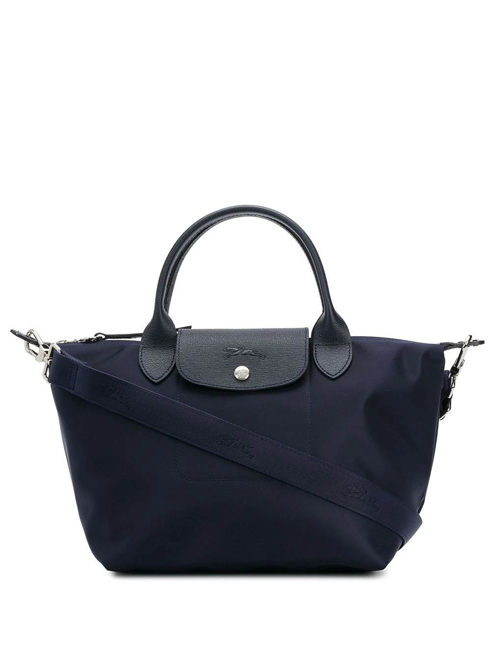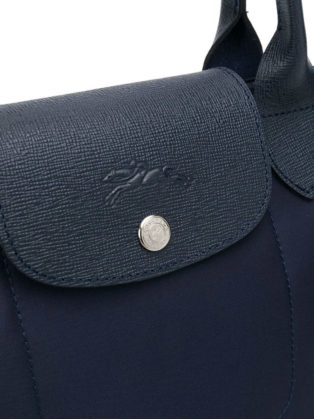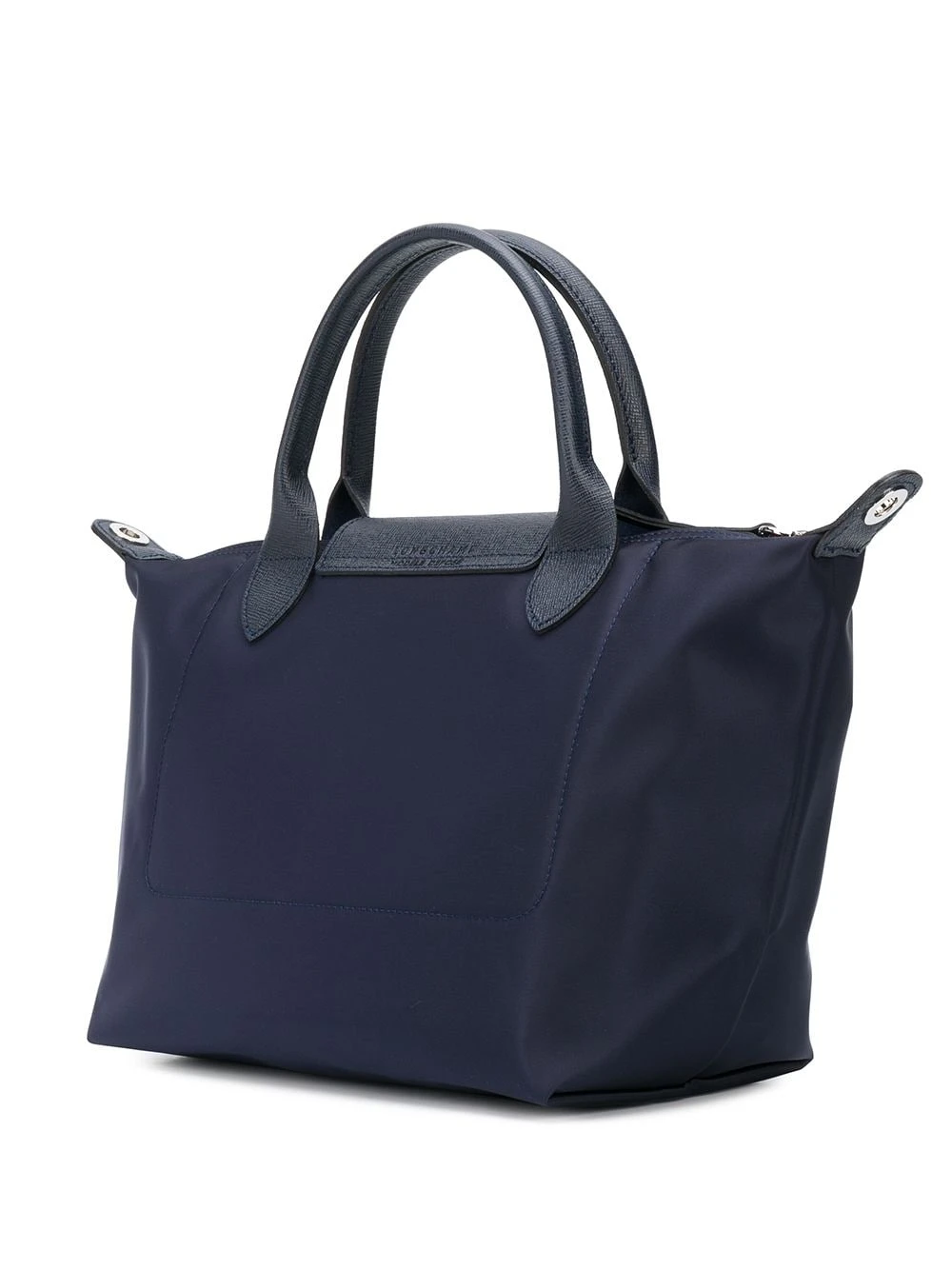 Sac cabas Le Pliage en cuir Longchamp avec anses sur le dessus, rabat replié sur le dessus et loquet et fermeture zippée sur le dessus. Couleur : bleu.