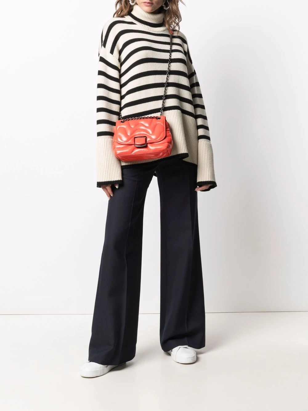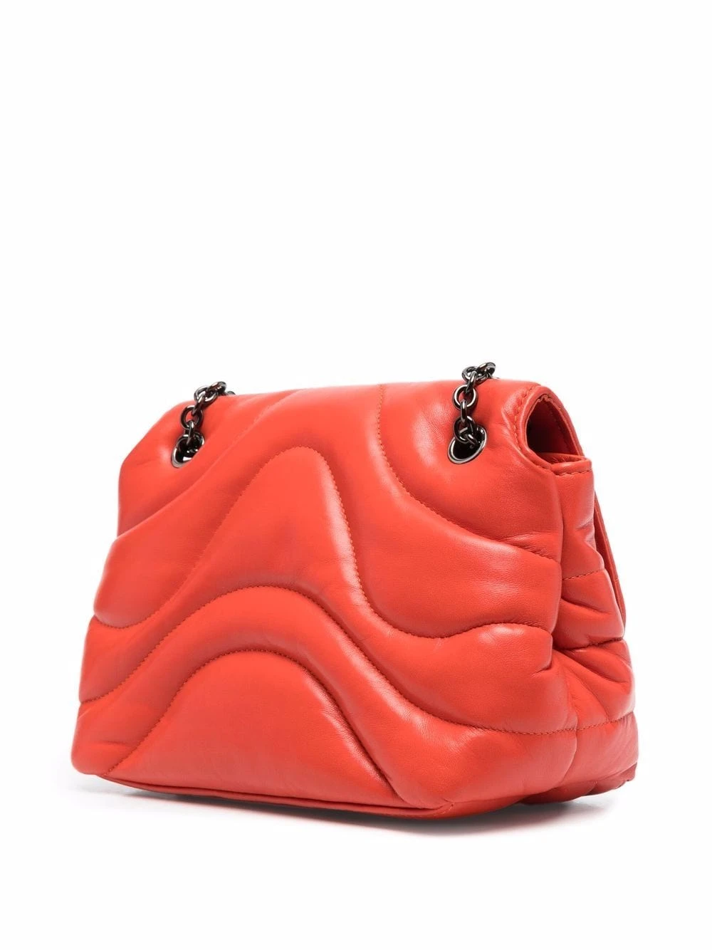 Design matelassé, rabat sur le dessus à fermeture magnétique, bride porté épaule en chaîne coulissante, compartiment principal, poches intérieures zippées. Couleur : orange. Matière : peau d’agneau.