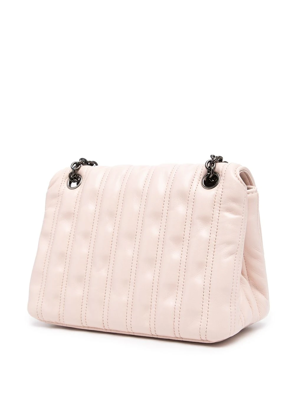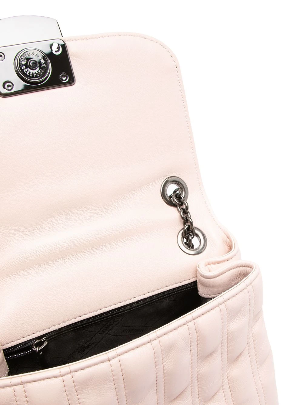 Bride porté épaule en chaîne, dessus à rabat avec bouton pression, compartiment principal, doublure à logo imprimé, poche intérieure zippée, effet matelassé. Matière : cuir.