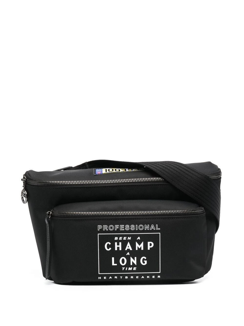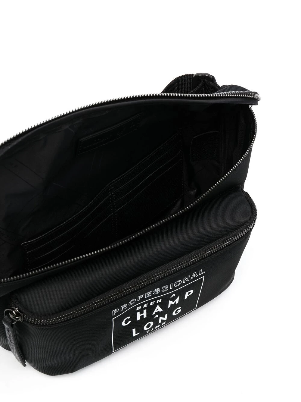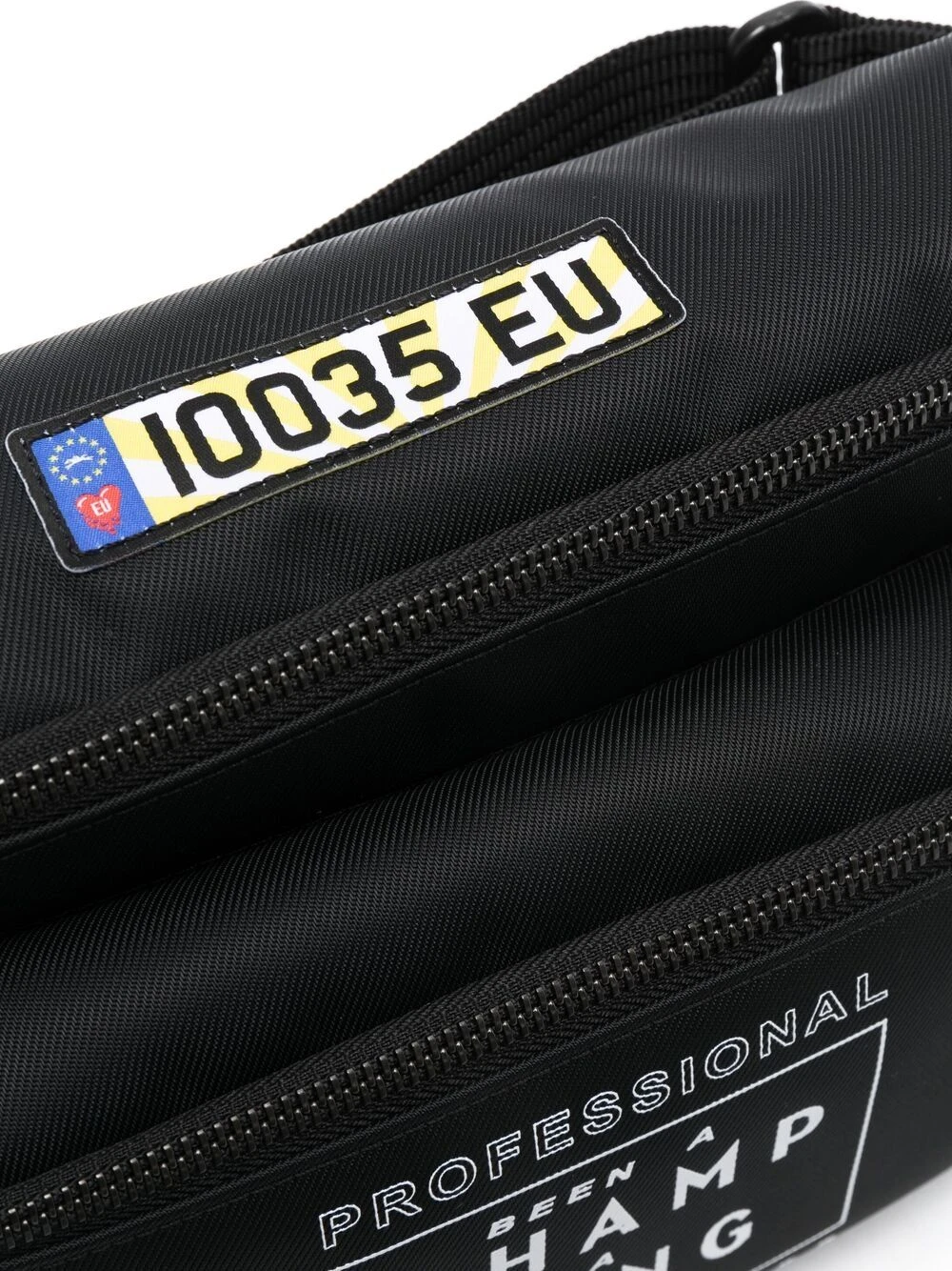 Slogan imprimé sur l’avant, poches à fermeture zippée devant, doublure à logo imprimé, compartiments intérieurs pour carte, patch logo intérieur, tirants ajustables. Couleur : noir.