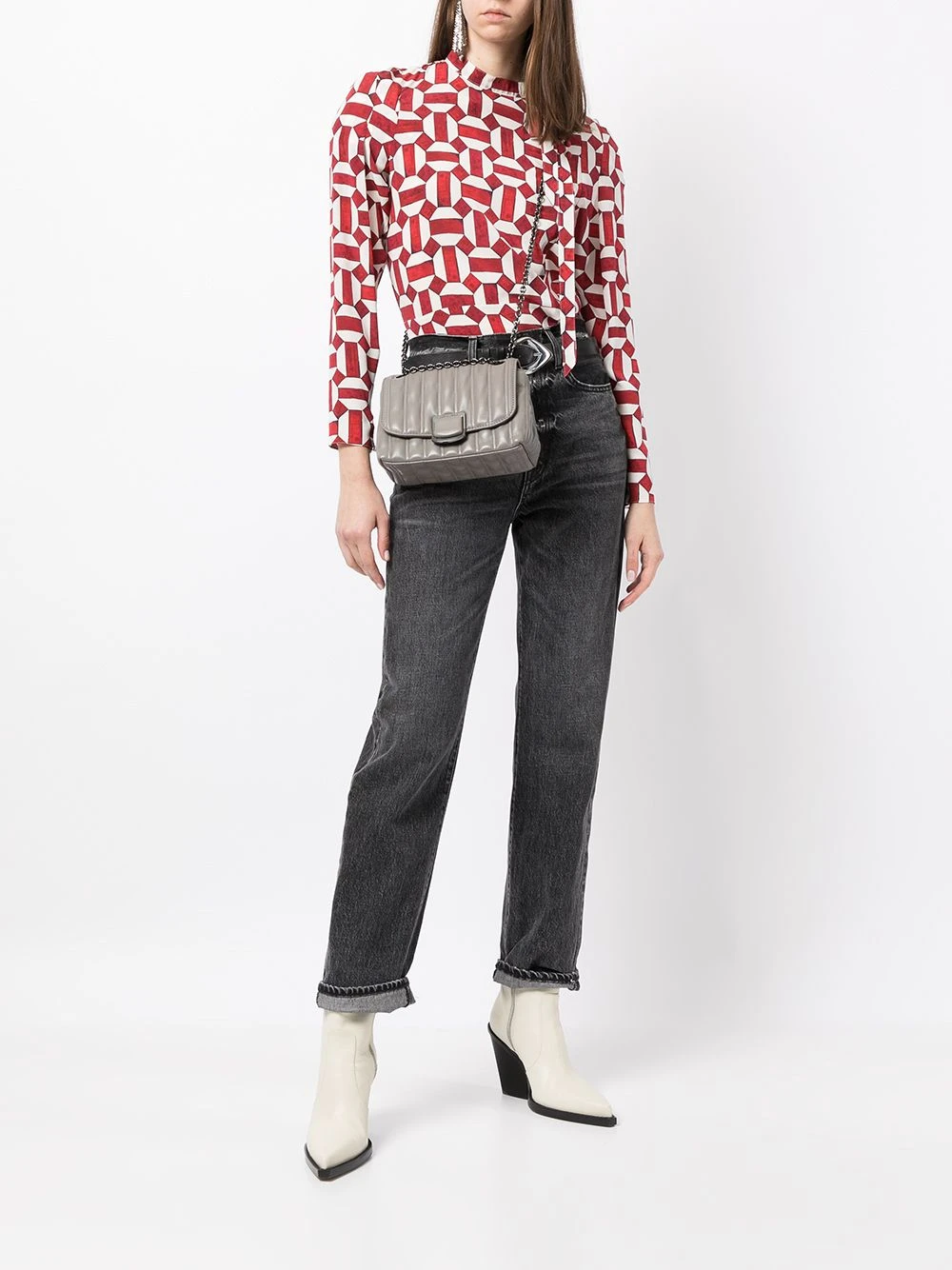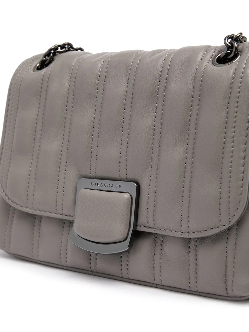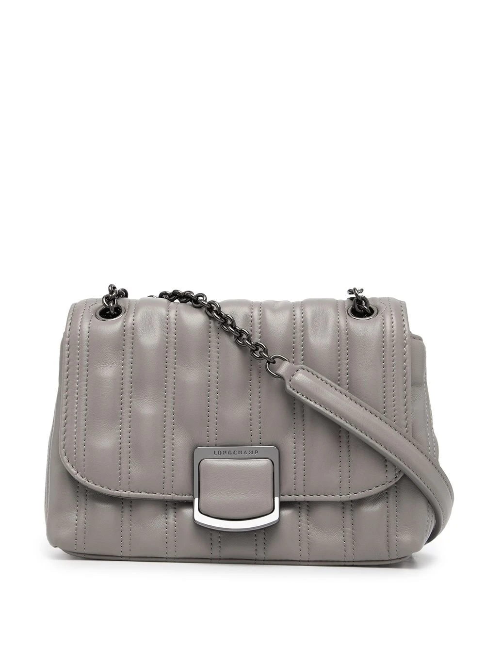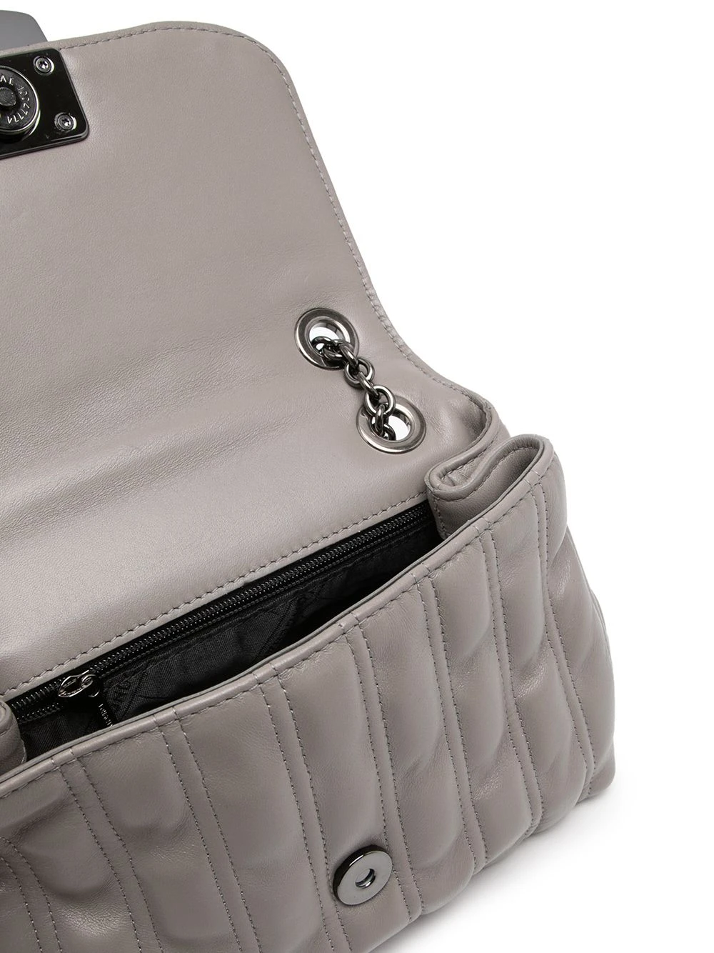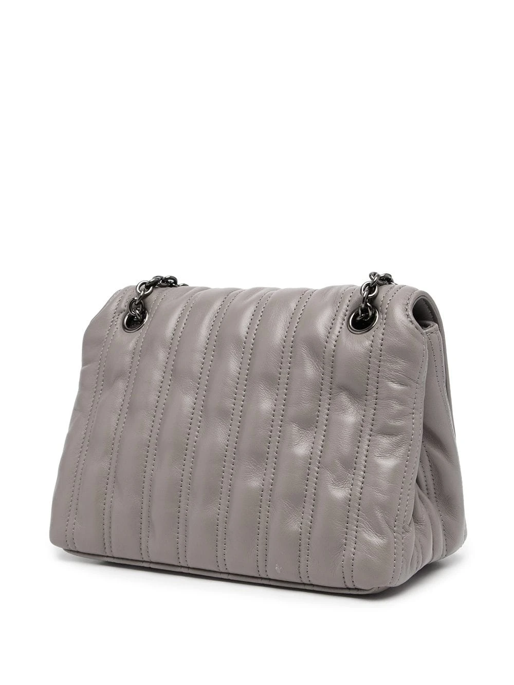 Effet matelassé, bride porté épaule en chaîne, dessus à rabat avec bouton pression, logo embossé sur le devant, compartiment principal. Matière : cuir.