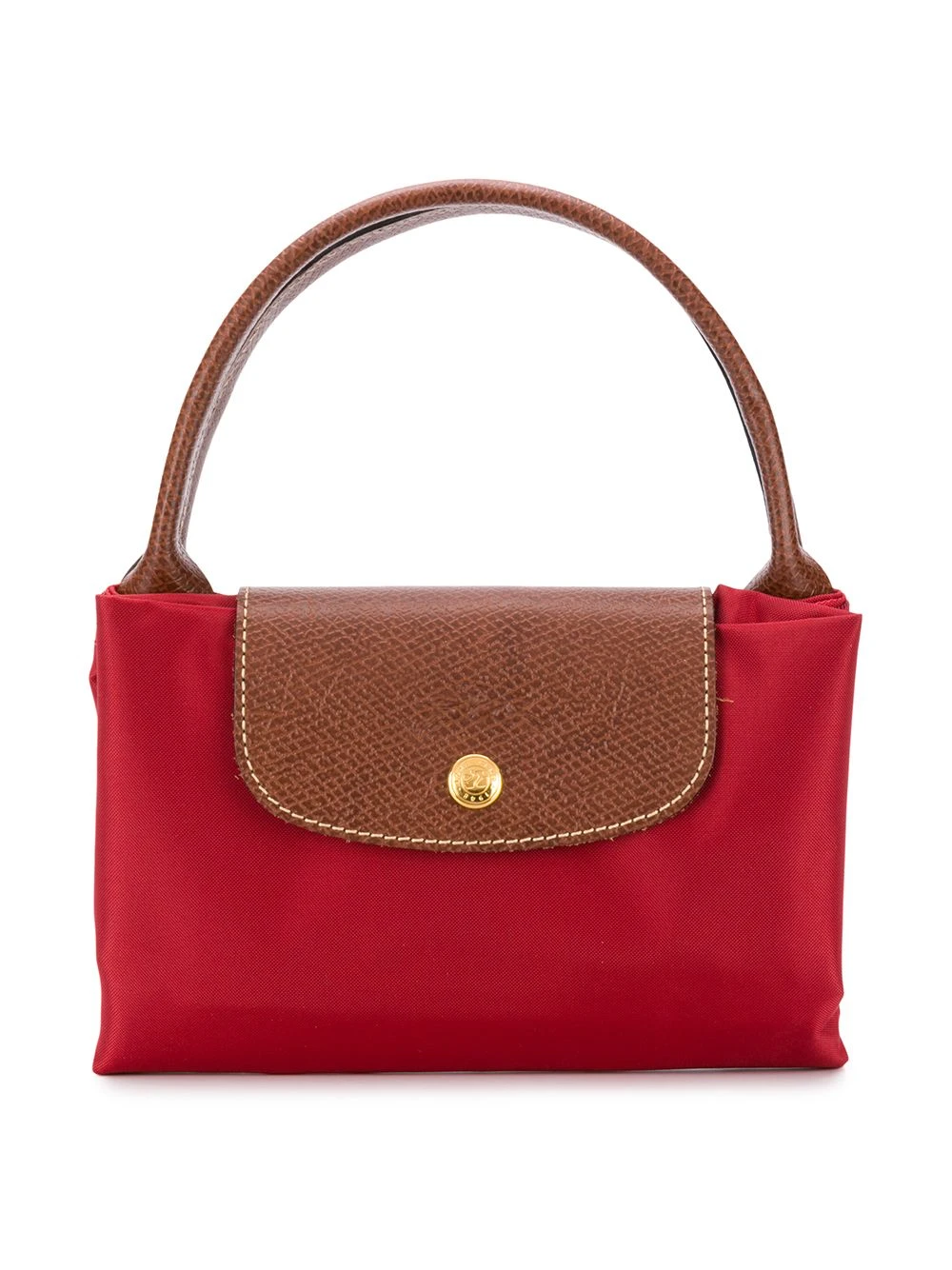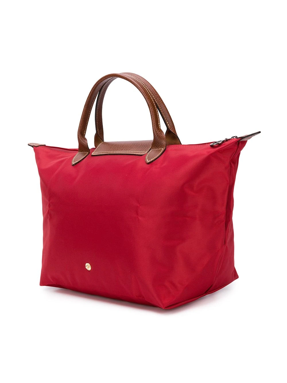 Sac cabas Le Pliage Longchamp avec rabat replié sur le dessus et loquet, rabat replié sur le dessus et loquet, fermeture zippée sur le dessus et détails argentés. Couleur : rouge.