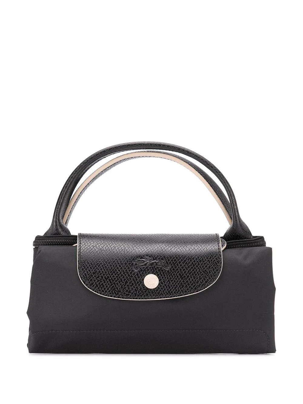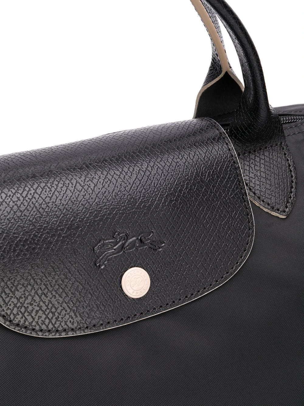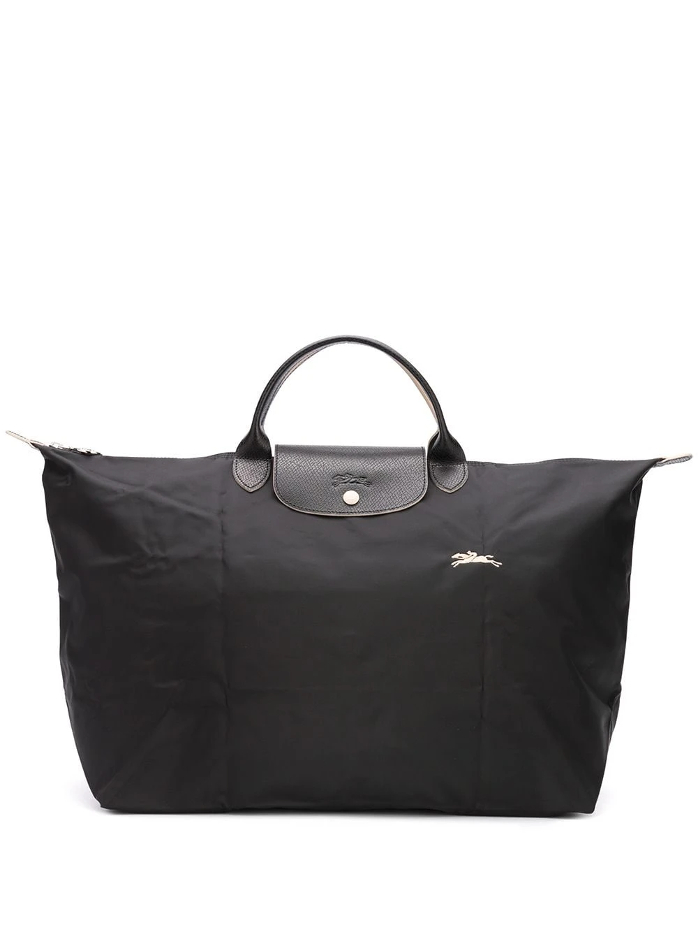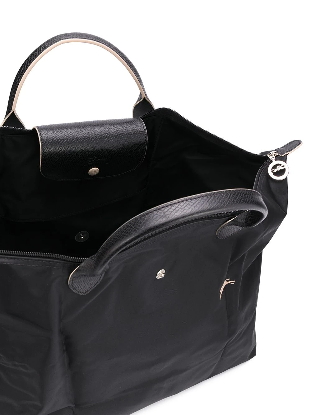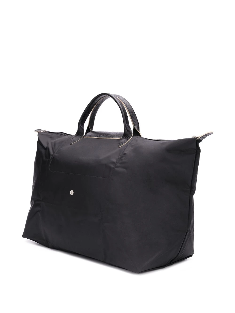 Sac cabas Le Pliage Travel Longchamp avec anses sur le dessus, bordure en cuir, logo brodé sur le devant, logo embossé et fermeture zippée sur le dessus. Couleur : noir.