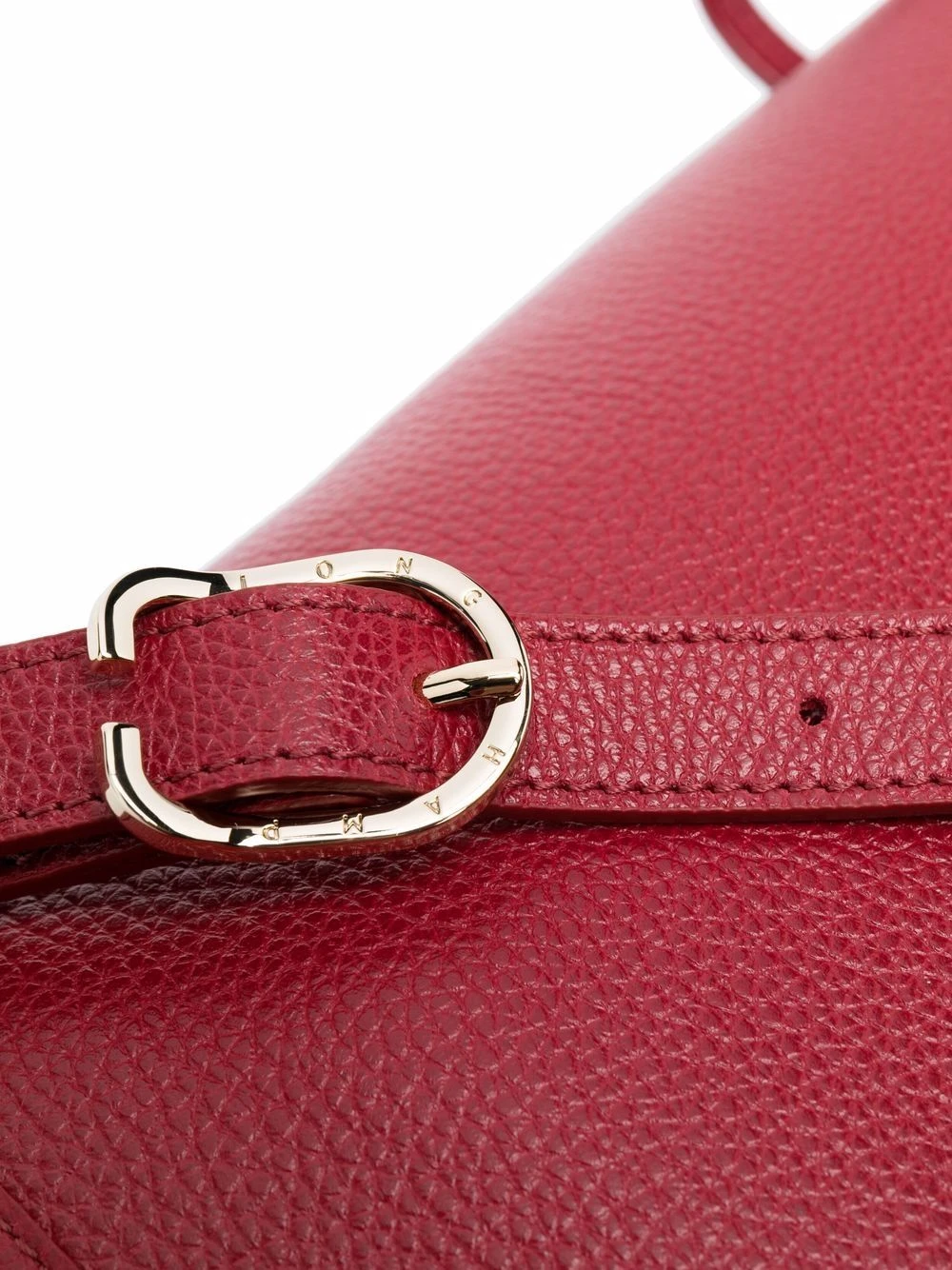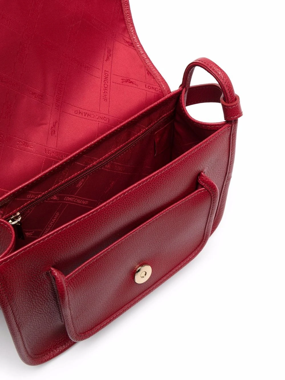 Texture grainée, logo embossé sur le devant, rabat sur le dessus, bretelle portée épaule unique, compartiment principal. Couleur : rouge. Matière : cuir.