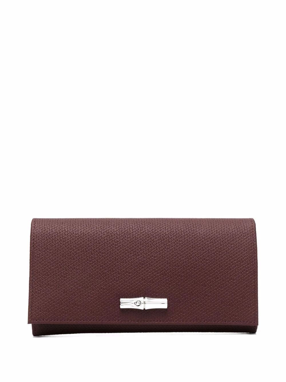 Texture grainée, plaque logo argentée, fermoir à presser, rabat sur le dessus, fentes pour carte, poche ticket. Matière : cuir.