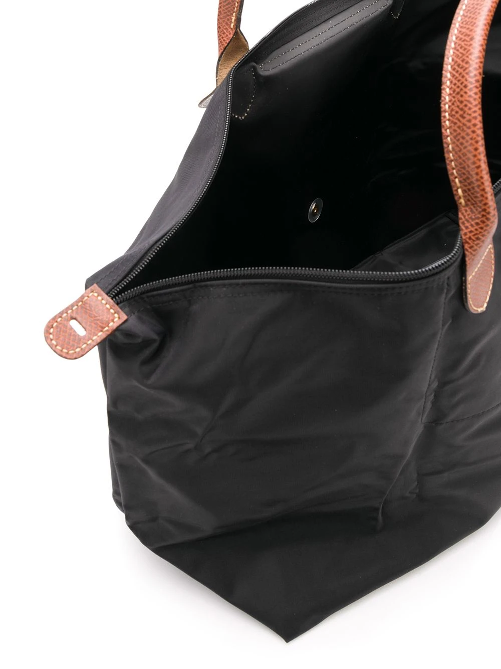 Sac cabas Le Pliage Longchamp avec anses arrondies, rabat replié sur le dessus et loquet, fermeture zippée sur le dessus et détails dorés. Couleur : noir.