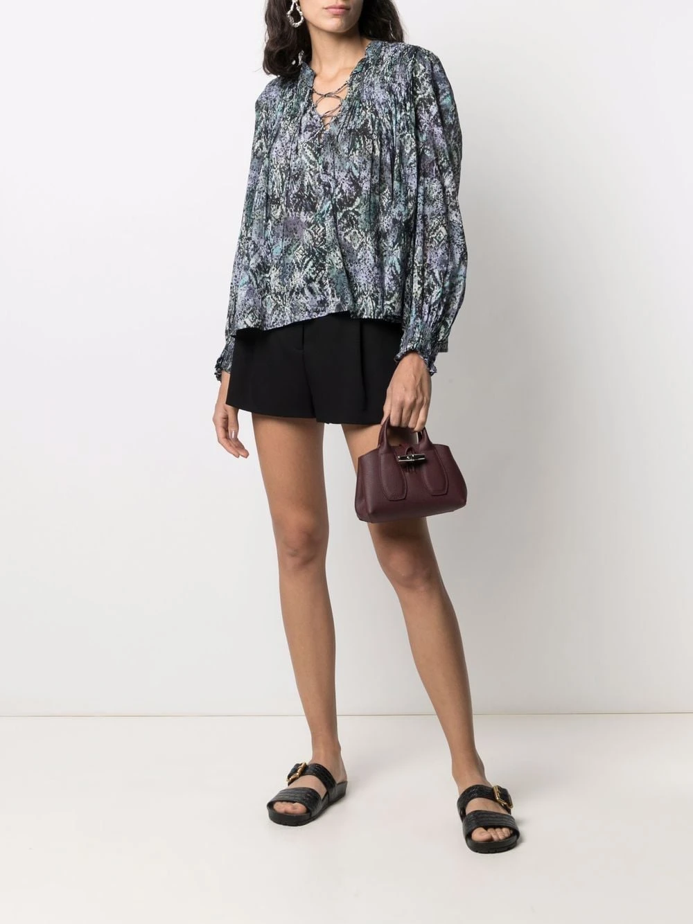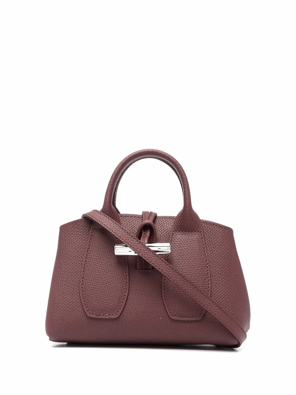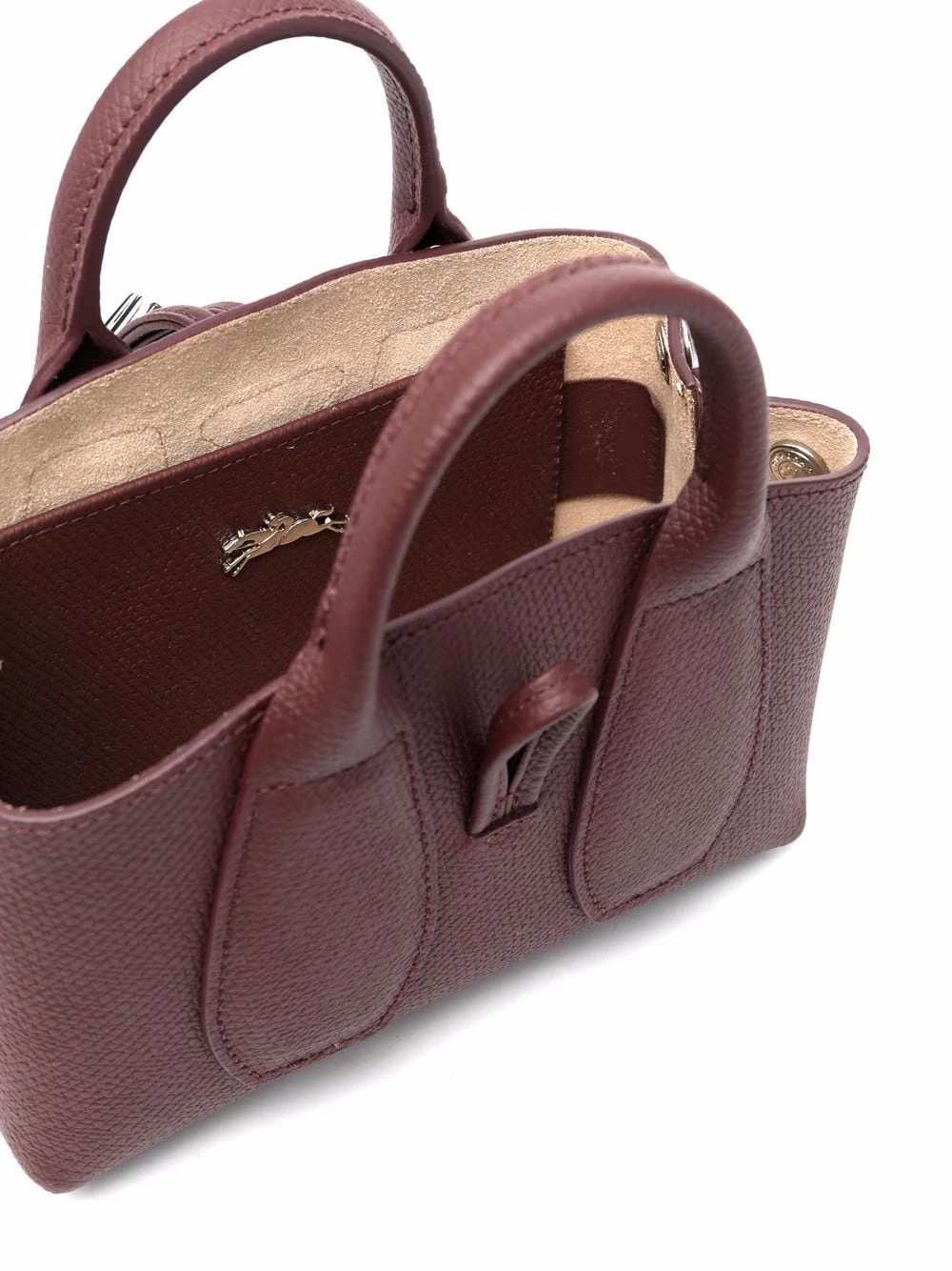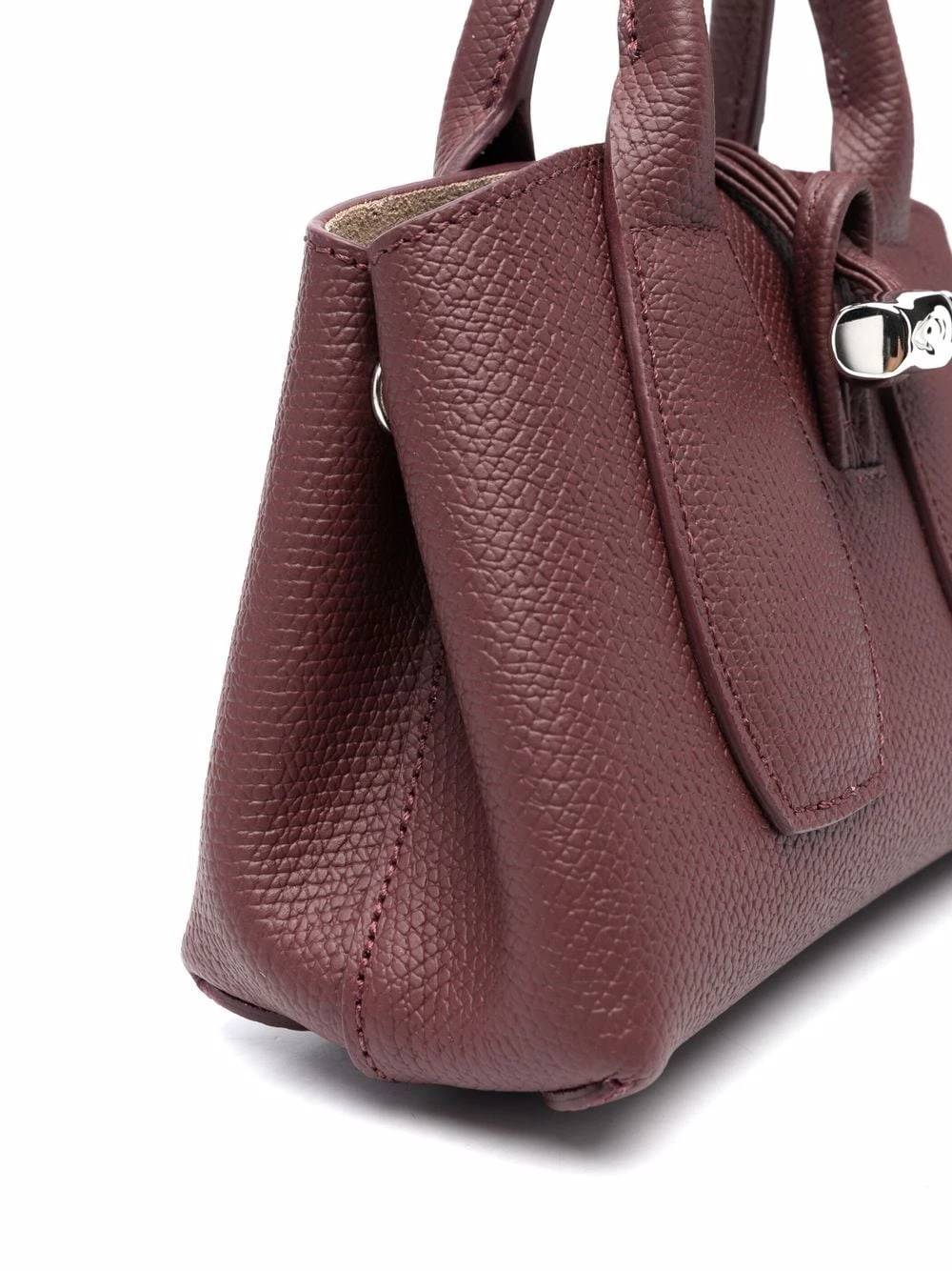 Texture grainée, fermeture duffle-coat, anses arrondies, fermeture à boutons pression, doublure en daim, plaque logo intérieure. Matière : cuir.