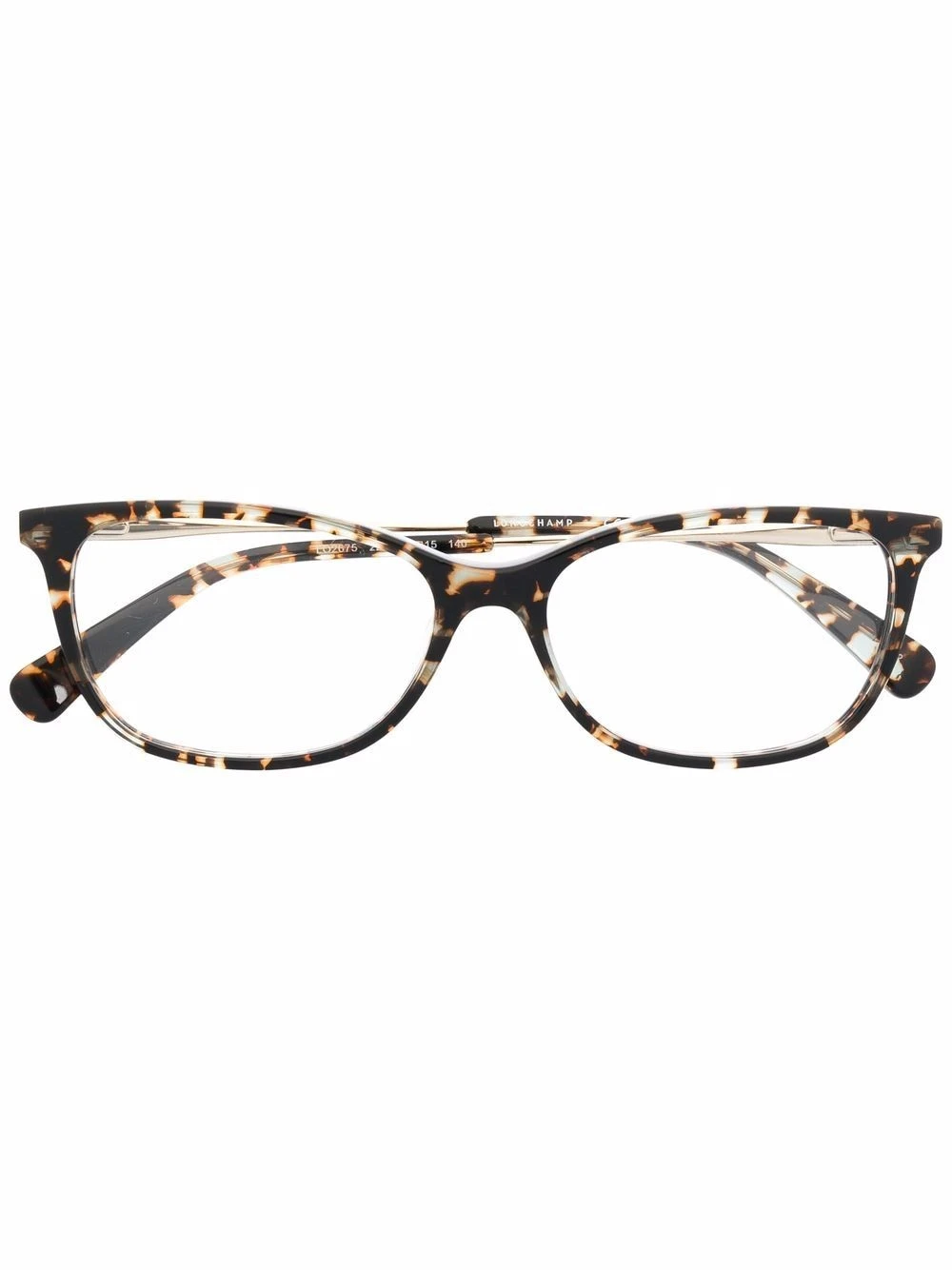 Effet écaille de tortue, monture carrée, verres transparents, verre à détail de décalque, plaquettes de nez, finitions en métal doré, logo embossé sur le côté, branches droites, extrémités incurvées. Couleur : marron. Matière : acétate. Ces lunettes sont livrées avec un étui de protection.