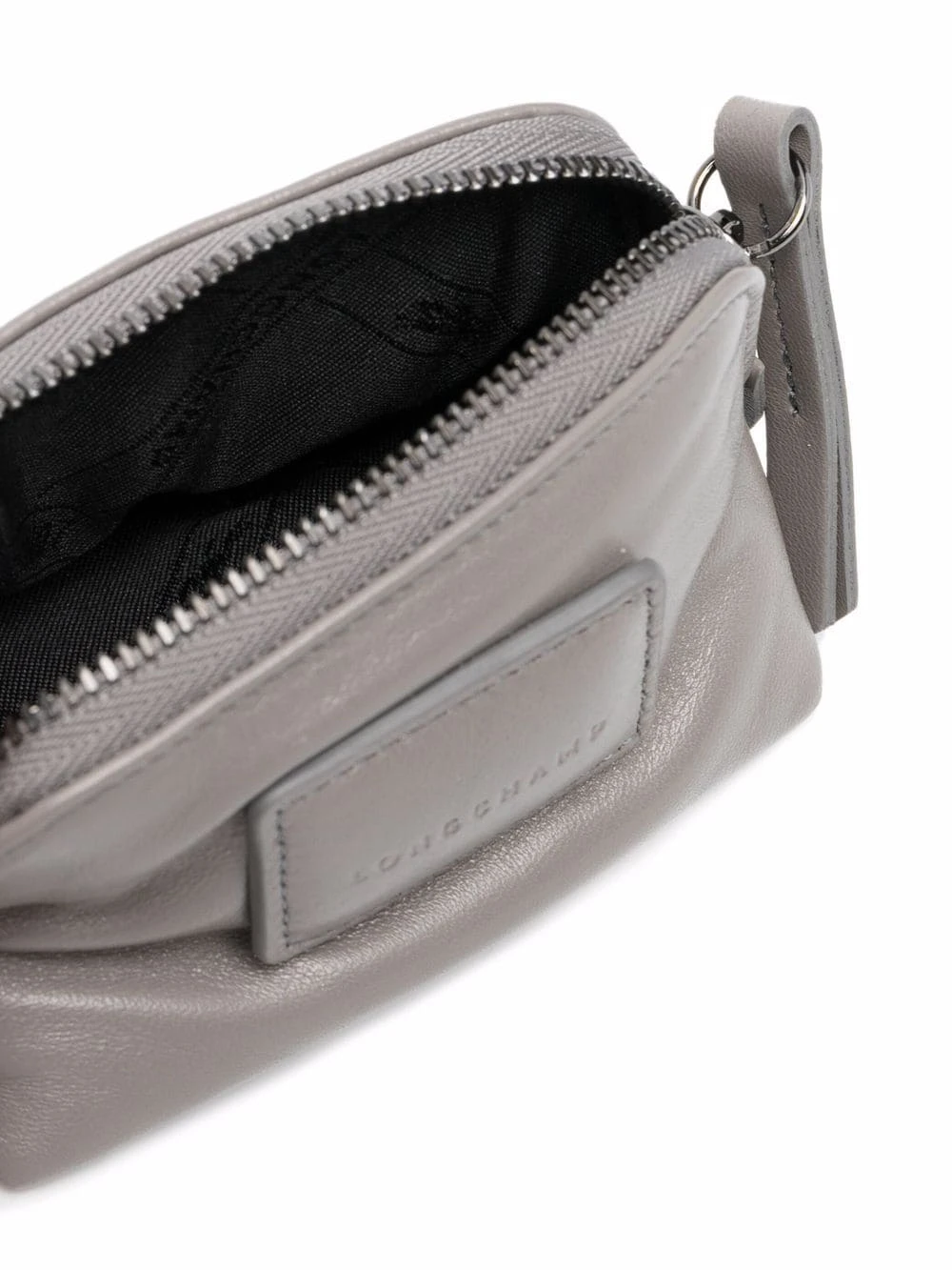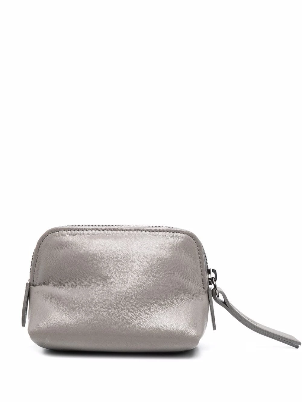 Ornements argentés, fermeture zippée sur le dessus, patch logo sur le devant, poche intérieure. Matière : peau d’agneau.