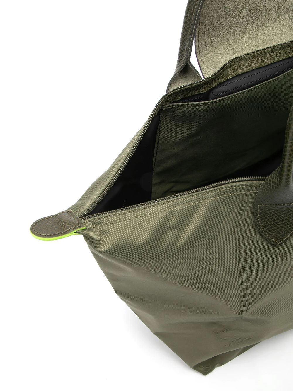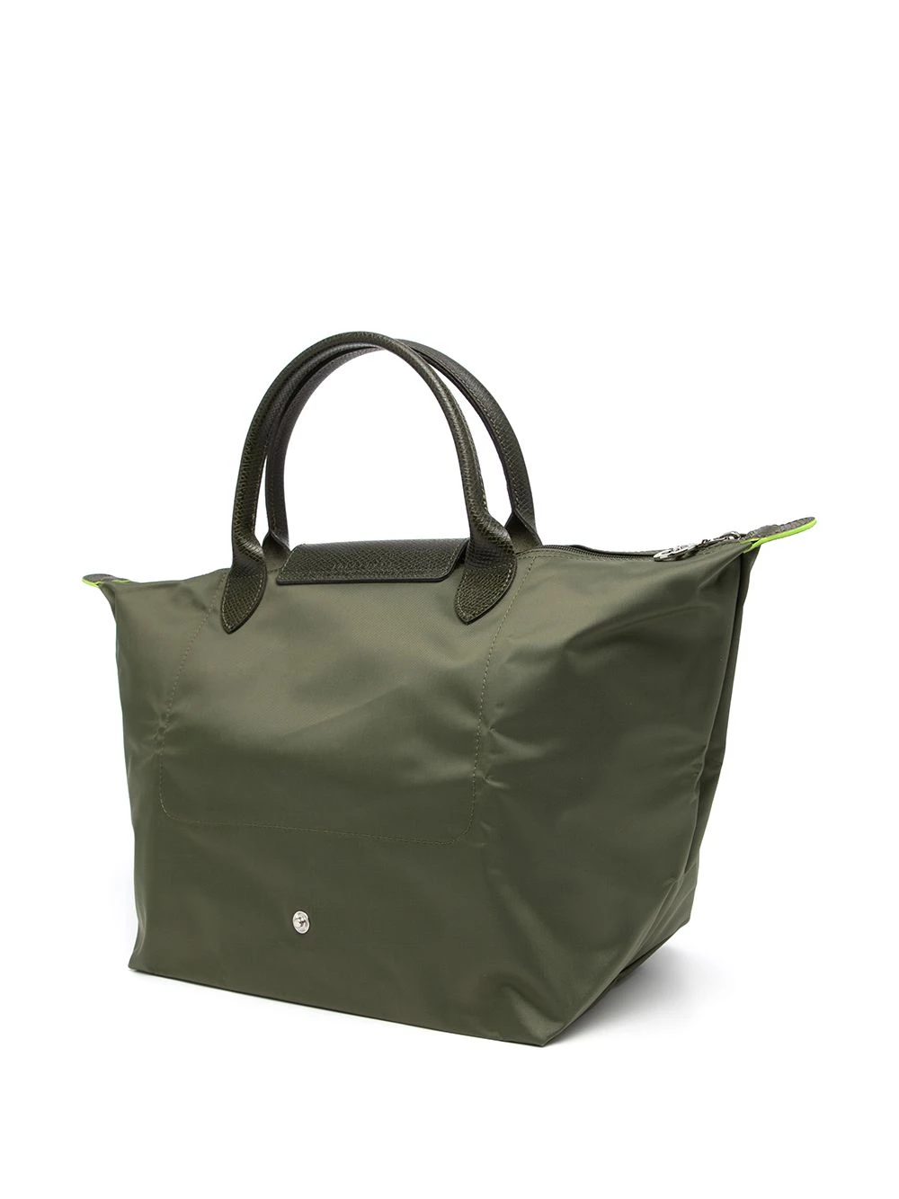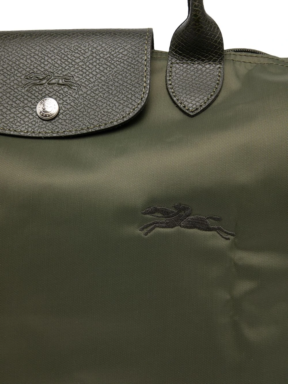 Design pliable, logo brodé, logo embossé sur le devant, compartiment principal, fermeture zippée sur le dessus, dessus à rabat avec bouton pression, anses sur le dessus.