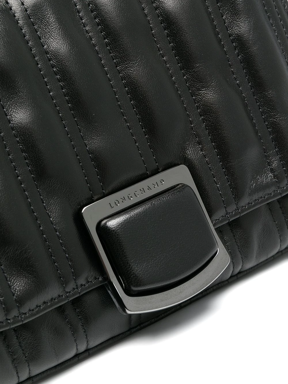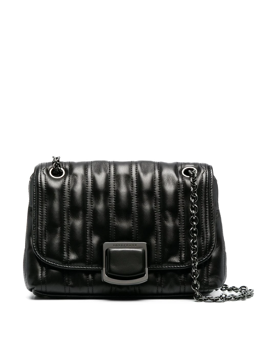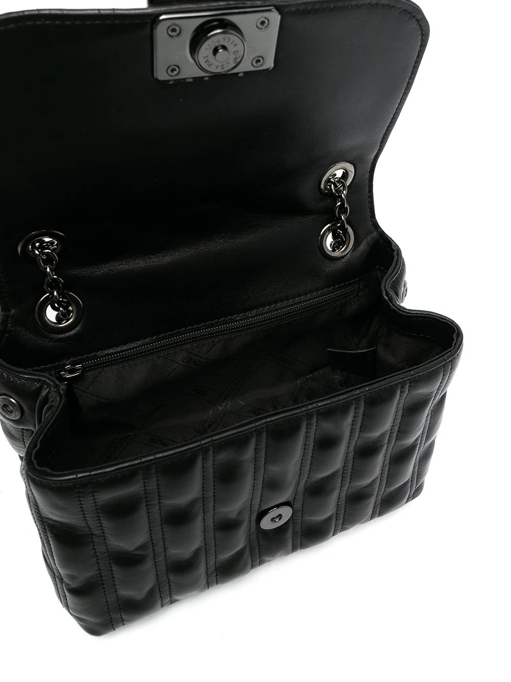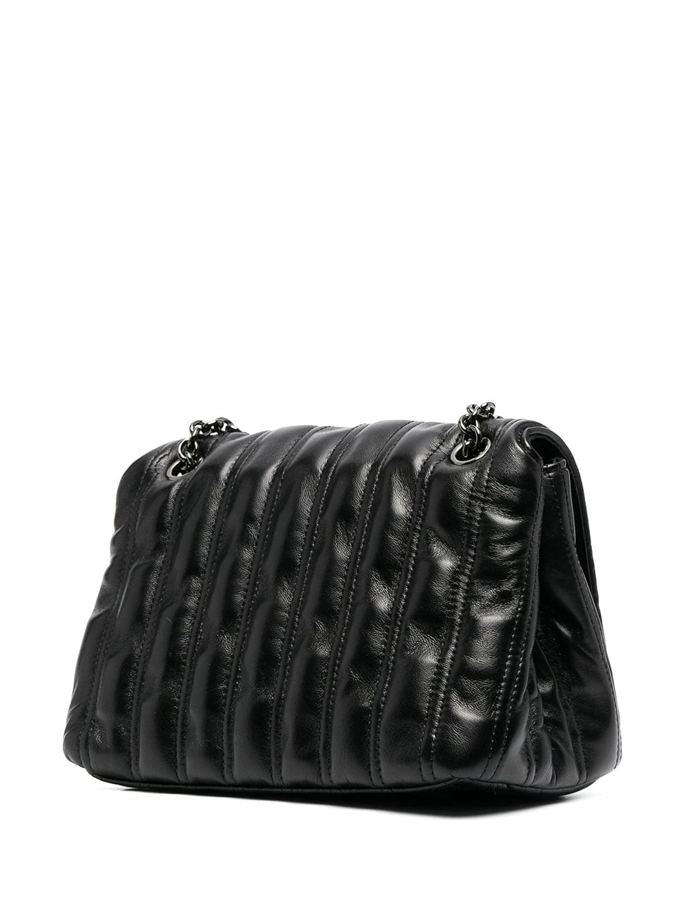 Design matelassé, rabat sur le dessus, plaque logo argentée, bride portée épaule en chaîne, poches intérieures zippées. Couleur : Noir. Matière : cuir d’agneau.