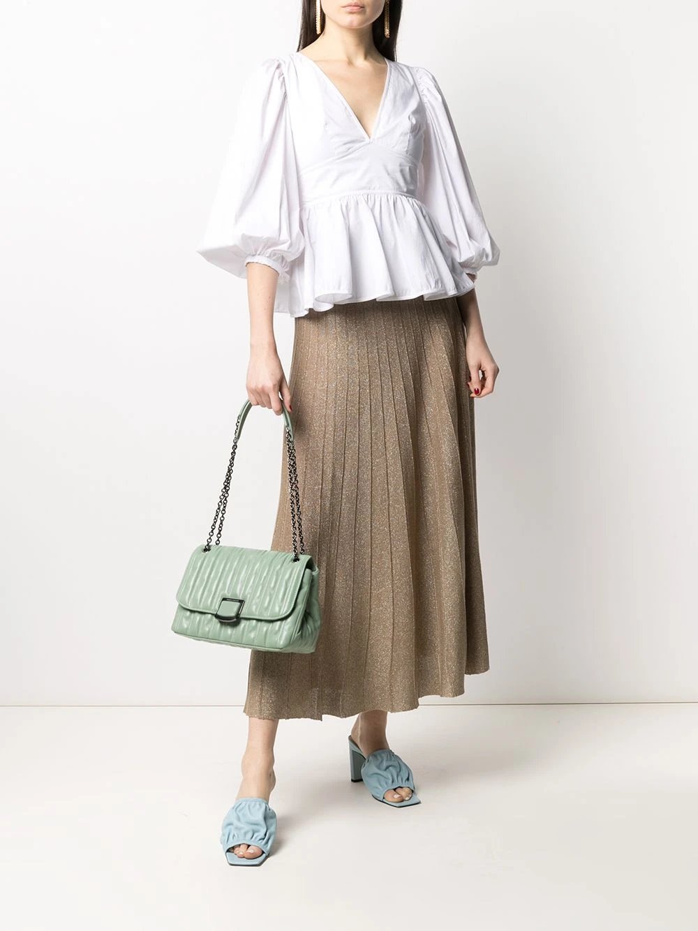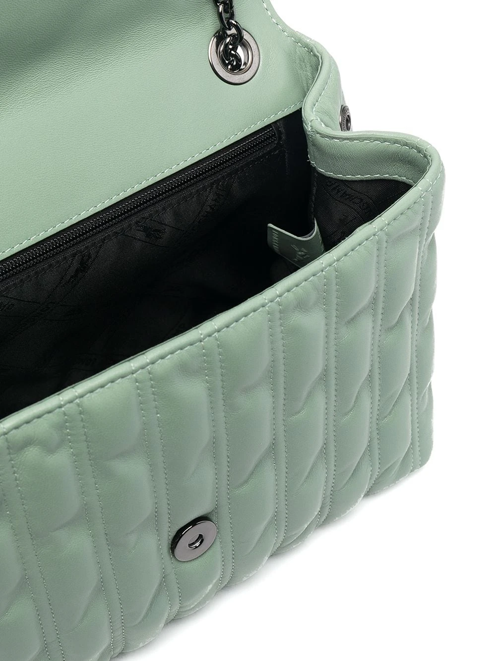 Design matelassé, rabat sur le dessus, plaque logo argentée, poches intérieures zippées, bride portée épaule en chaîne. Matière : cuir d’agneau.