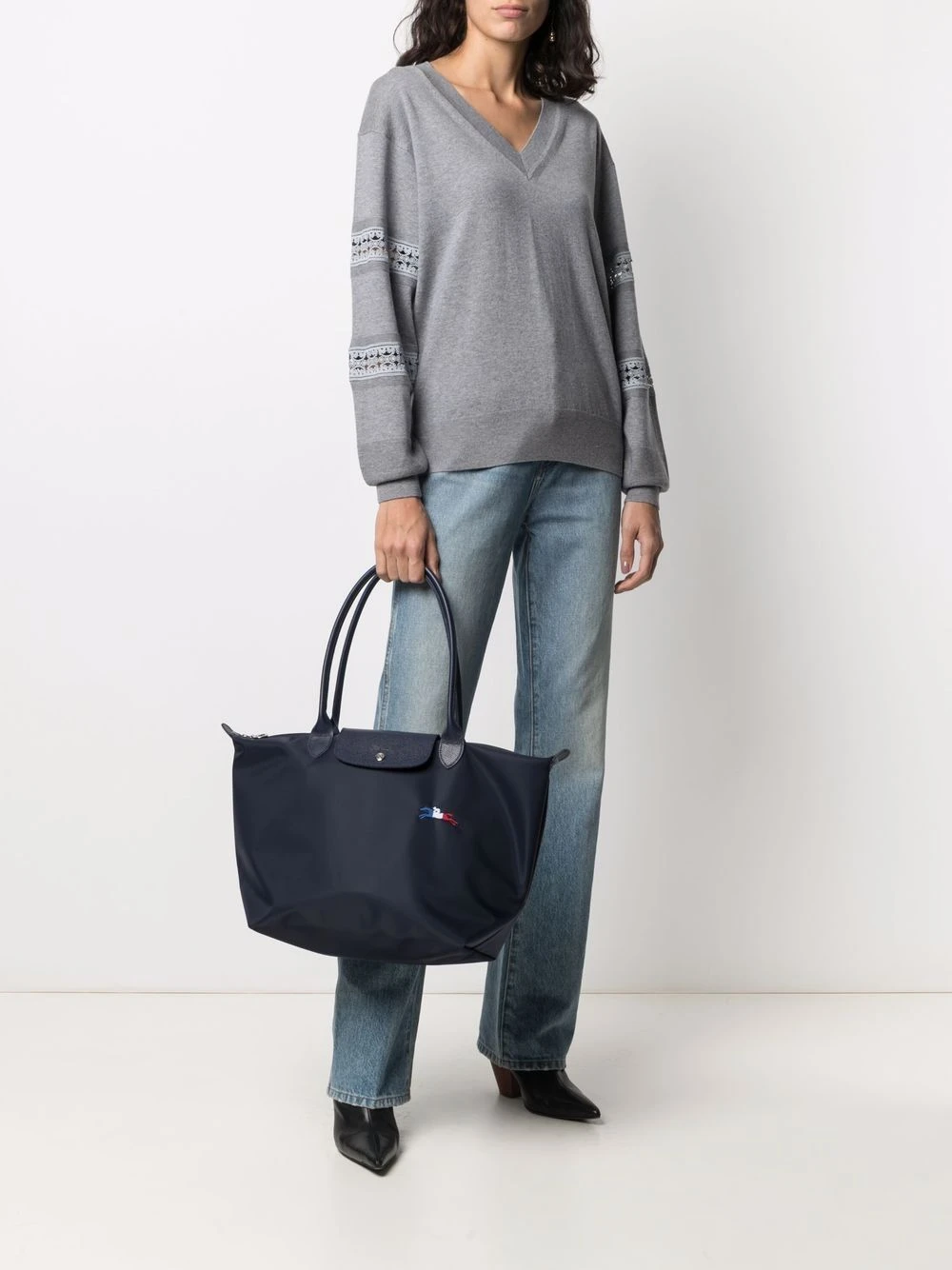 Texture grainée, patch logo sur le devant, fermeture à boutons pression, anses sur le dessus.