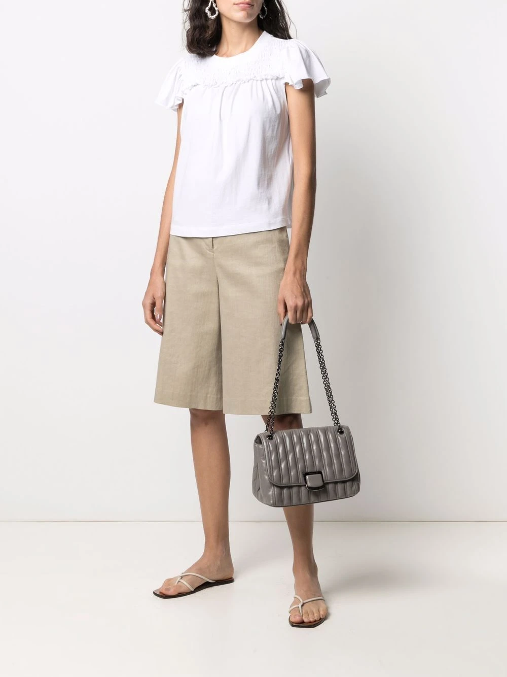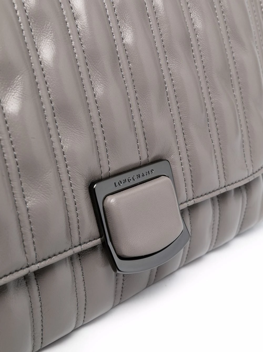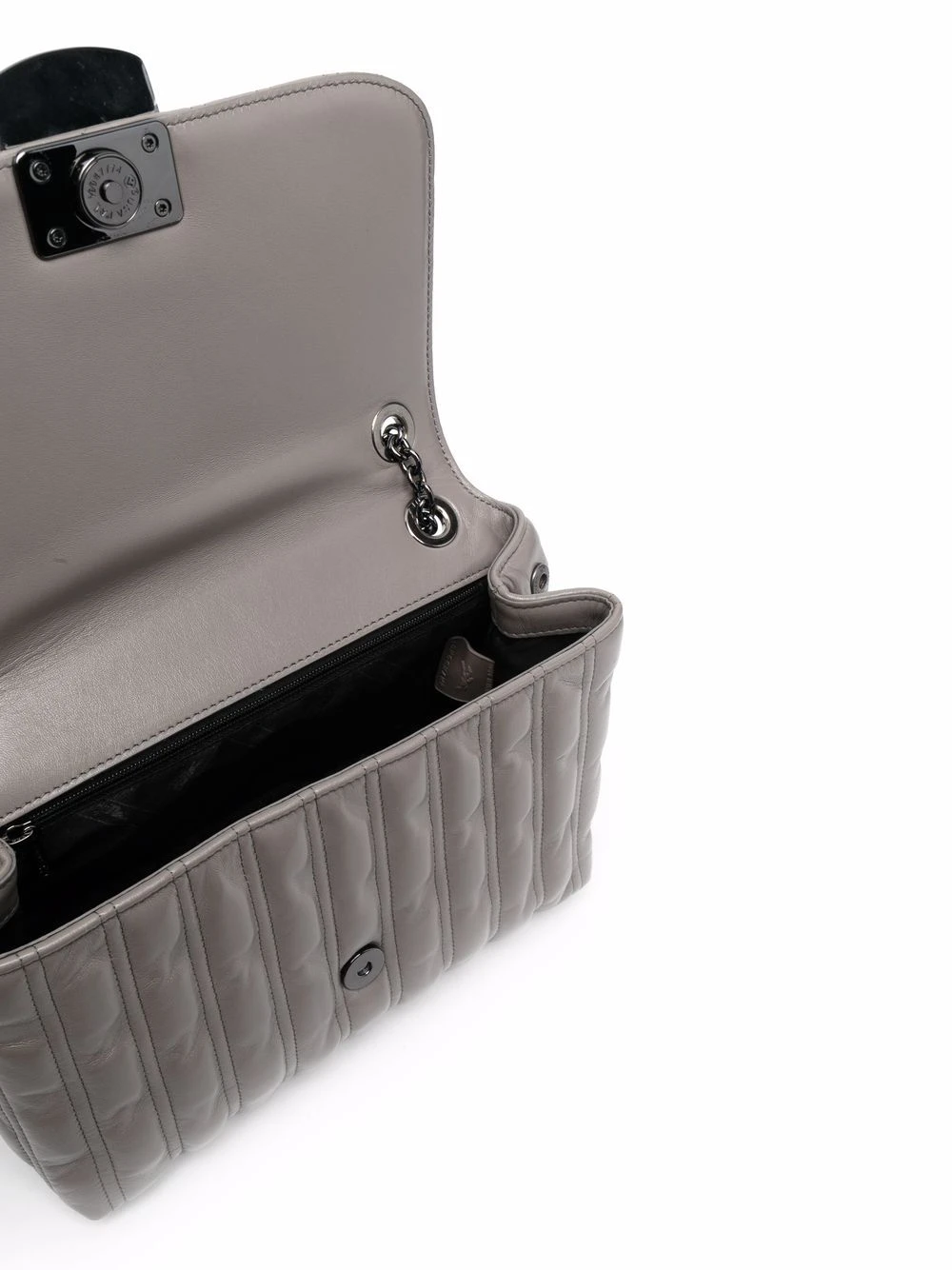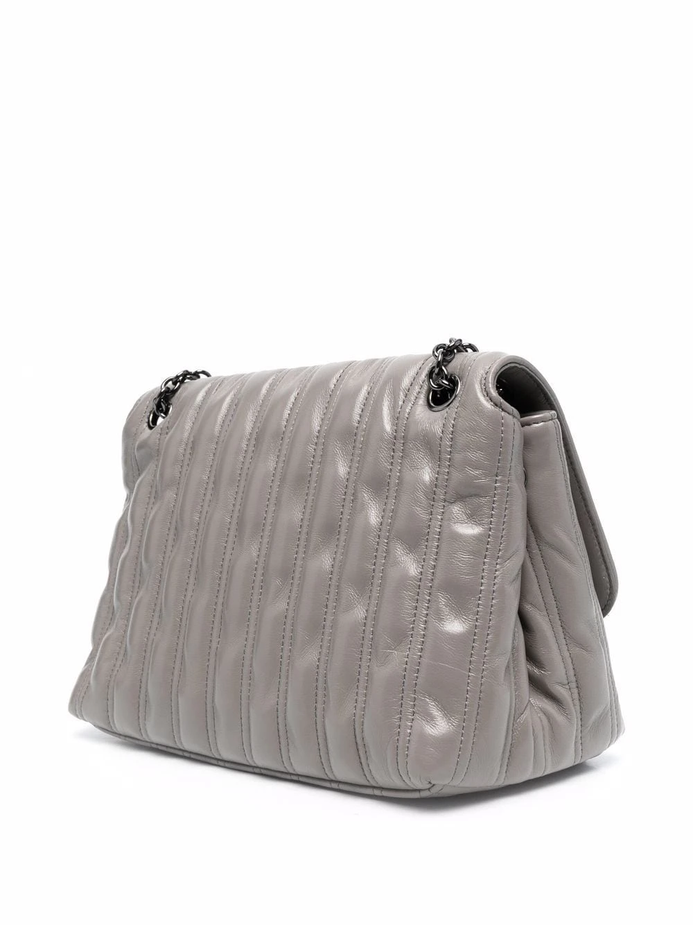 Design matelassé, plaque logo, logo gravé, rabat sur le dessus, bride porté épaule en chaîne. Couleur : gris. Matière : peau d’agneau.
